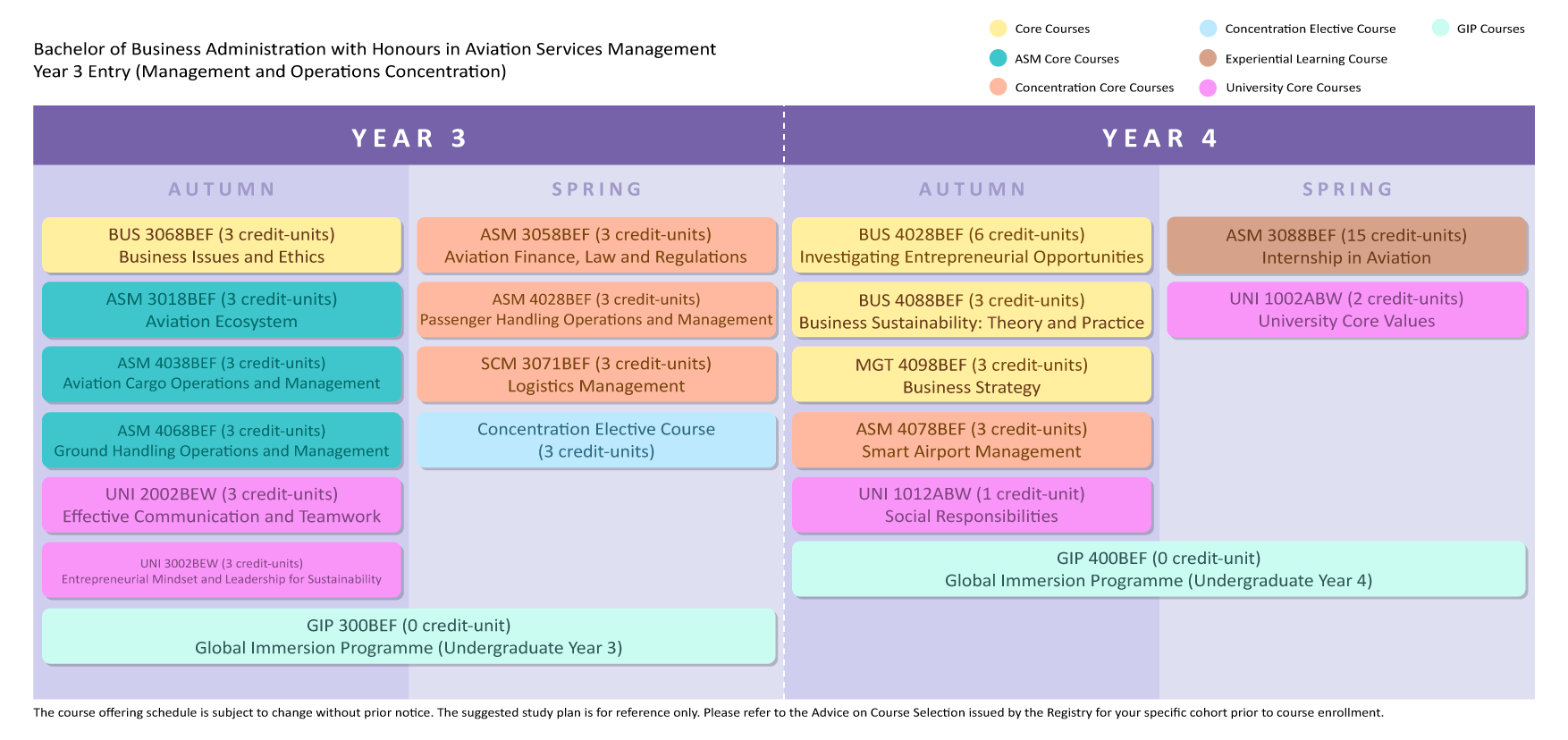 Graduates of Management and Operations Concentration will be prepared to embark on a professional career in a wide range of areas or sectors in the aviation services industry. These include airfreight, aircraft leasing, aircraft maintenance, airlines, airport management, aviation security, passenger services, airline catering, business aviation, ground handling and ramp handling, etc.