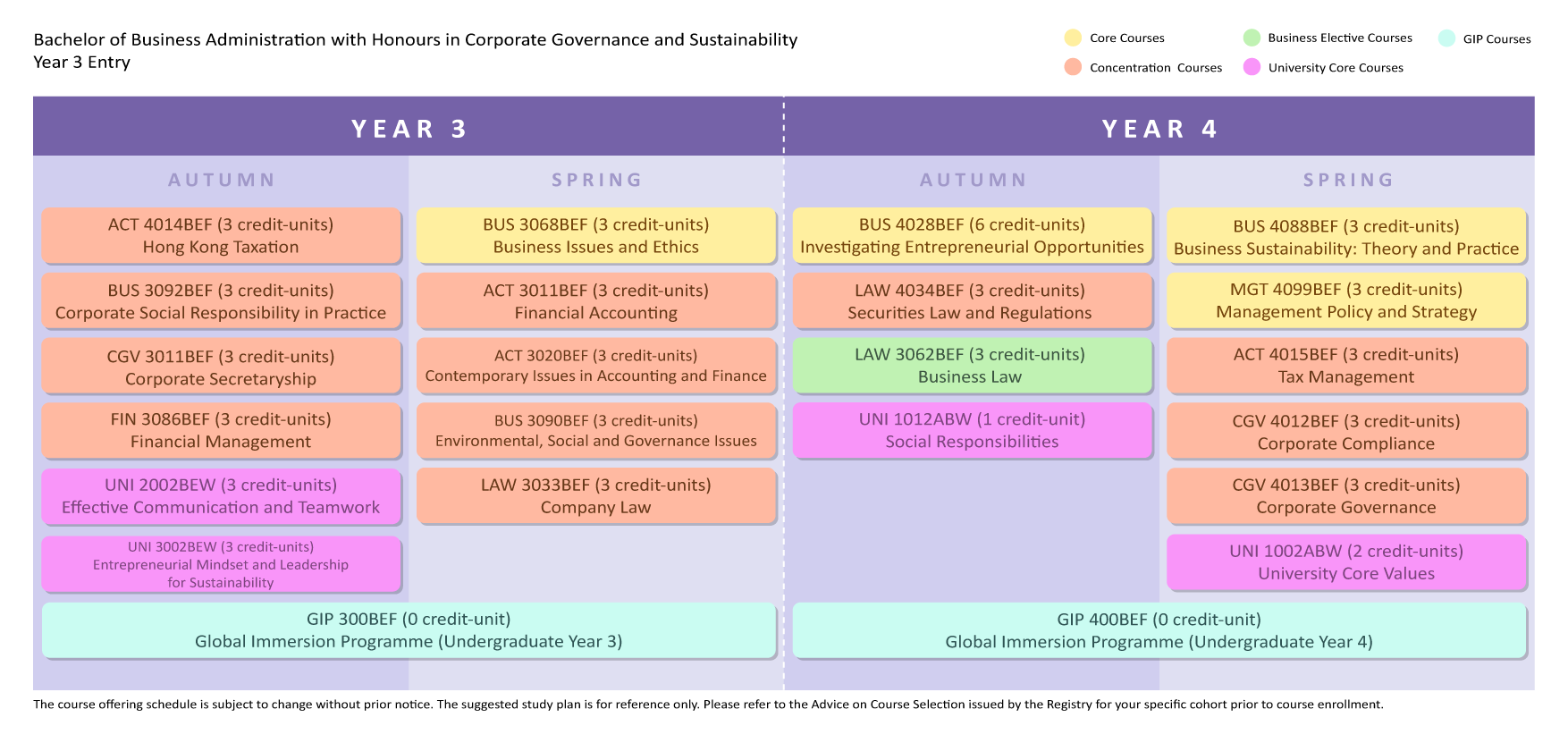 The programme is a Partnership Bachelor's Programme (PBP) accredited by The Hong Kong Chartered Governance Institute (HKCGI). Graduates of PBP are eligible for a maximum of four modules of exemption under the Chartered Governance Qualifying Programme (CGQP). These modules include Hong Kong Company Law, Interpreting Financial and Accounting Information, Strategic Management, and Hong Kong Taxation.