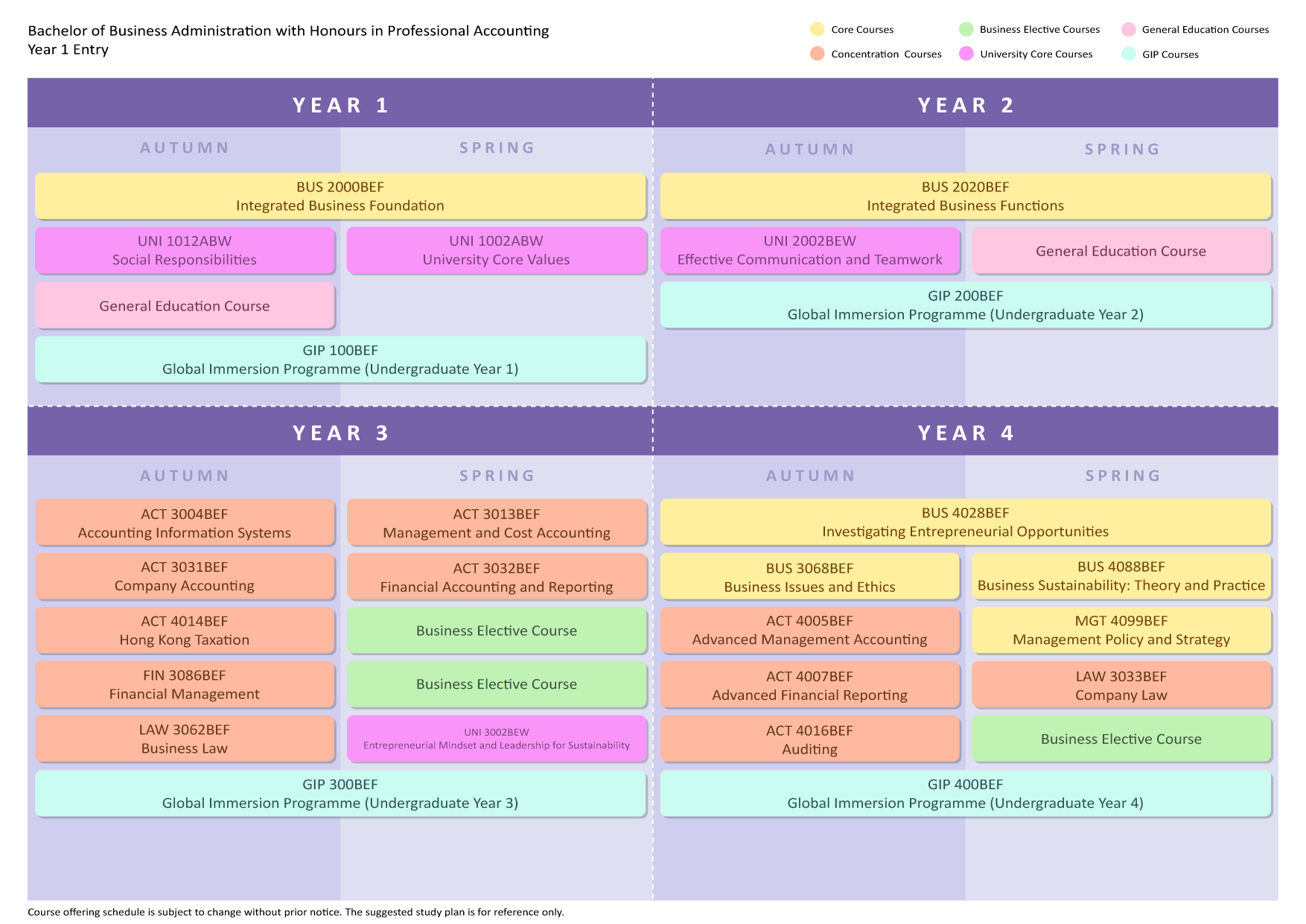 This programme prepares students for a professional qualification in accounting and equips them with broad-based knowledge in financial accounting, management accounting, taxation, auditing, law and accounting information systems. Graduates can seek employment as professional accountants or pursue careers in related fields such as auditing, taxation and business advisory services.