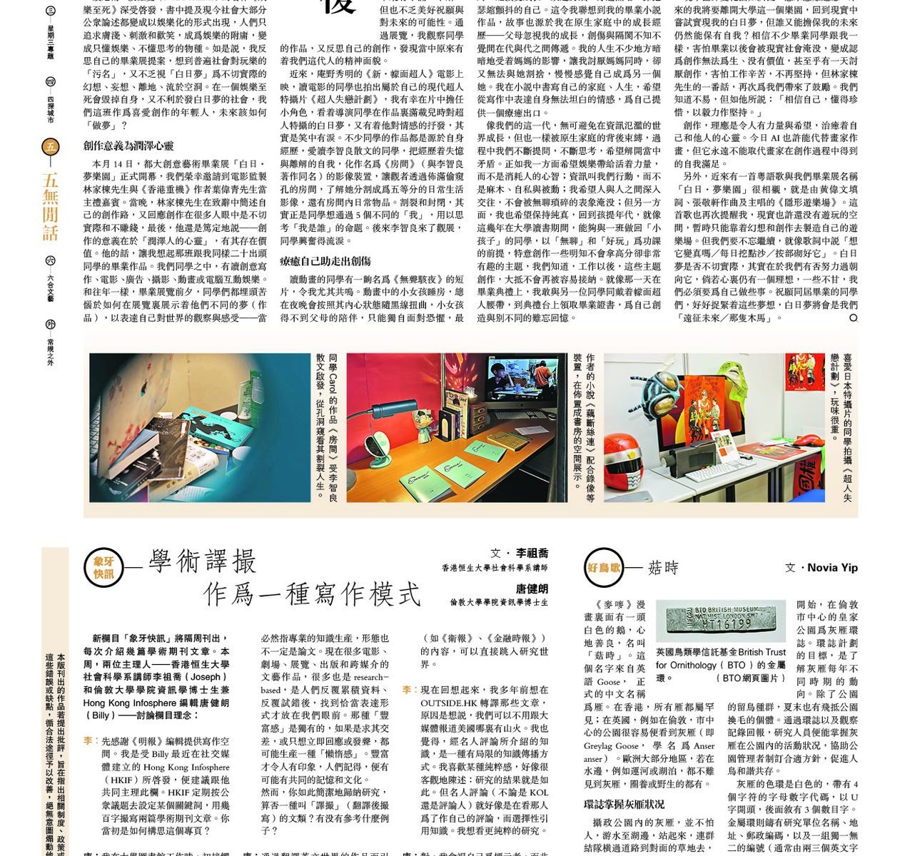 主頁 課程簡介 教職員 學生作品 師生活動 聯絡我們 Facebook Mail-bulk Instagram 【邵棟老師的好消息】 繼Billy老師的《給下一輪廣東歌盛世備忘錄》取得到第四屆香港出版雙年獎後,邵棟老師又為大家帶來好消息。邵棟老師的短篇小說著作《空氣結他》,剛剛於八月入圍2023年第六屆寶珀理想國文學獎初選名單,這個文學獎的評審陣容強大,包括普林斯頓大學的李翊雲教授、台灣作家及評論家唐諾、內地作家馬伯庸及葉兆言,能夠從近八十部作品擠身其中,一點也不容易。 《空氣結他》有著邵棟老師在家鄉的經歷及來港後的十年觀察與想像,每個故事都圍繞一件日常物品或一個隨處可見的場所發生開來。可以說,平常日子故事,有著他細膩獨特的角度。有關評審對《空氣結他》更有以下評價:「能夠把小說寫得這麼飽滿、稠密、流動、自然,相當驚喜。」 這本名為《空氣結他》的小說集沒有一篇以此命名,想了解邵棟老師這個「空氣結他」的有趣寓意?快找本小說來看看吧。 參考連結: https://mp.weixin.qq.com/s/bVTD0KUGMW2WT5RXtZLEwA