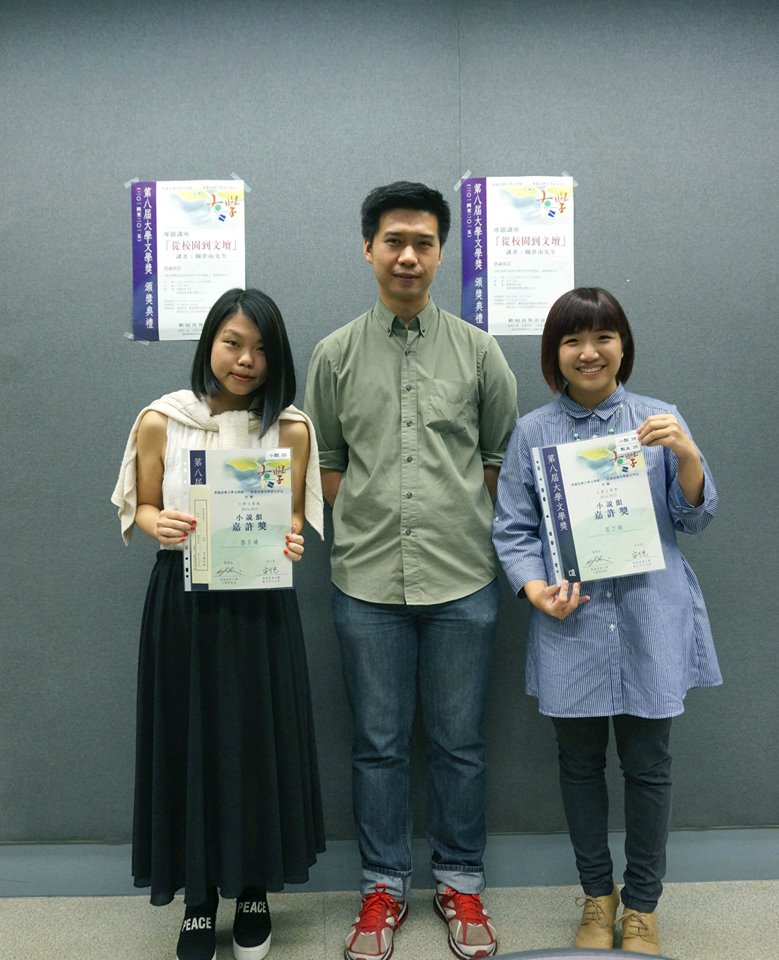 主頁 課程簡介 教職員 學生作品 師生活動 聯絡我們 Facebook Mail-bulk Instagram 畢業生何靖淇憑作品〈浮城誌‧二〉於第六屆全球華文青年文學奬(中文大學主辦)獲得短篇小說組二等優秀奬,而同學尹嘉茵〈天使被自殺〉、楊怡雯〈我城〉、李婉儀〈樹木誌異〉亦獲大會頒發鼓勵奬。 何靖淇小姐(右)與尹嘉茵同學(左)與本課程梁慕靈博士於頒獎禮合照
