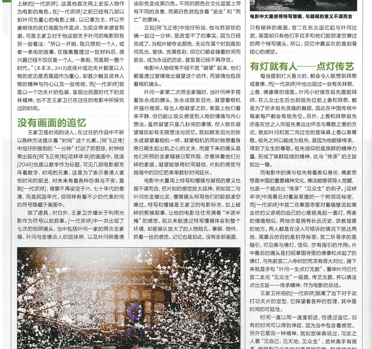 吳國灝〈逝去的年代〉收入上海《看電影》雜誌,2016年第1期。 羅日璁〈《東邪西毒》的文學性〉收入上海《看電影》雜誌,2016年第1期。 付裕〈《一代宗師》王家衛的簡與繁〉收入上海《看電影》雜誌,2015年