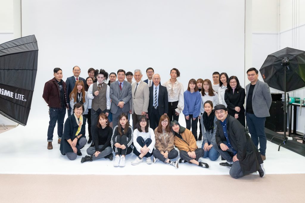 Guests of the Tin Ka Ping Foundation visit the teaching facilities of the OUHK and take a group photos with the students from the Creative Arts programme.