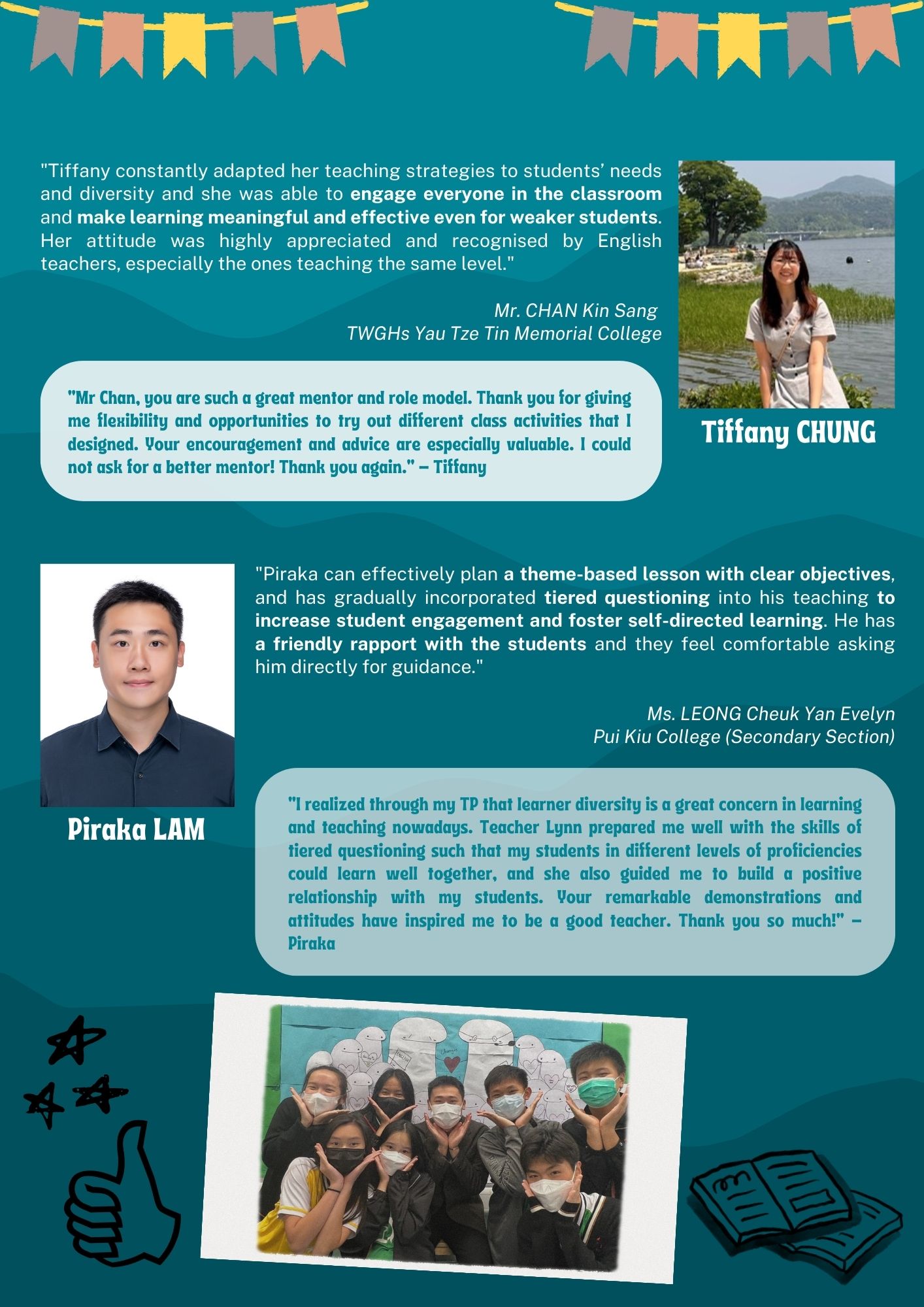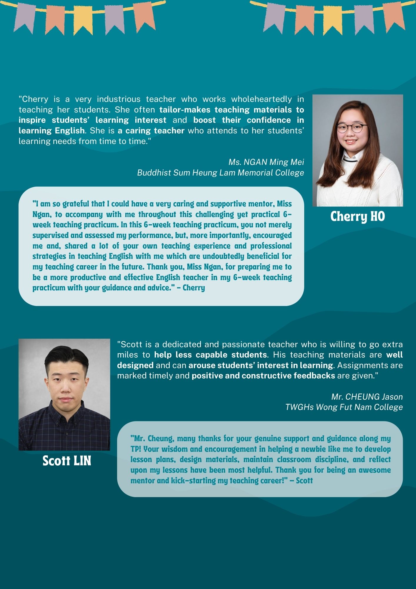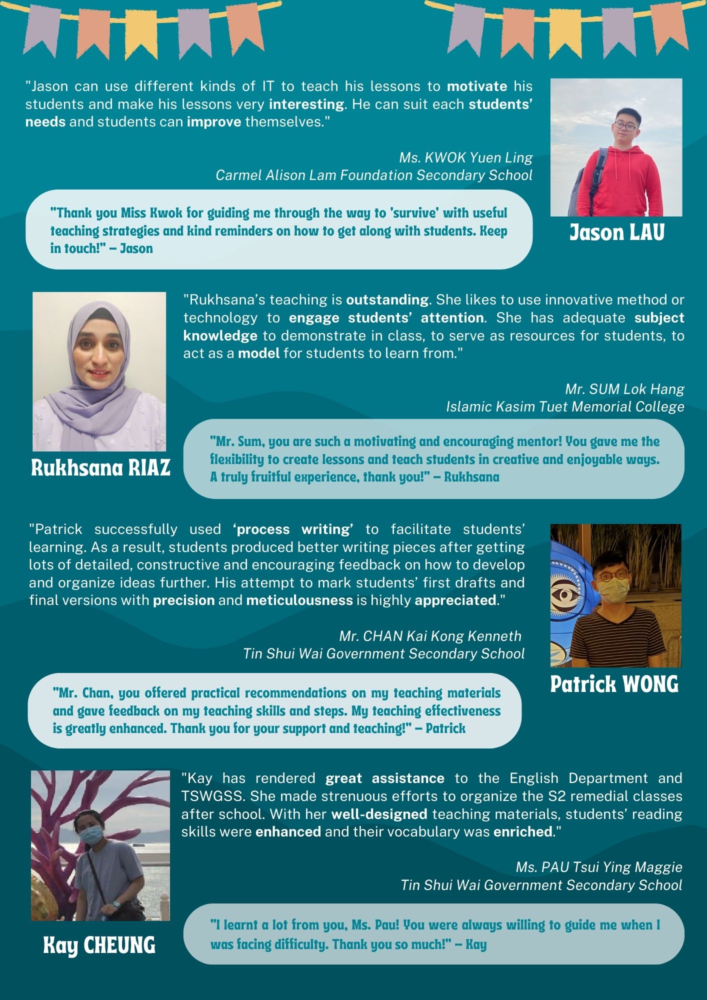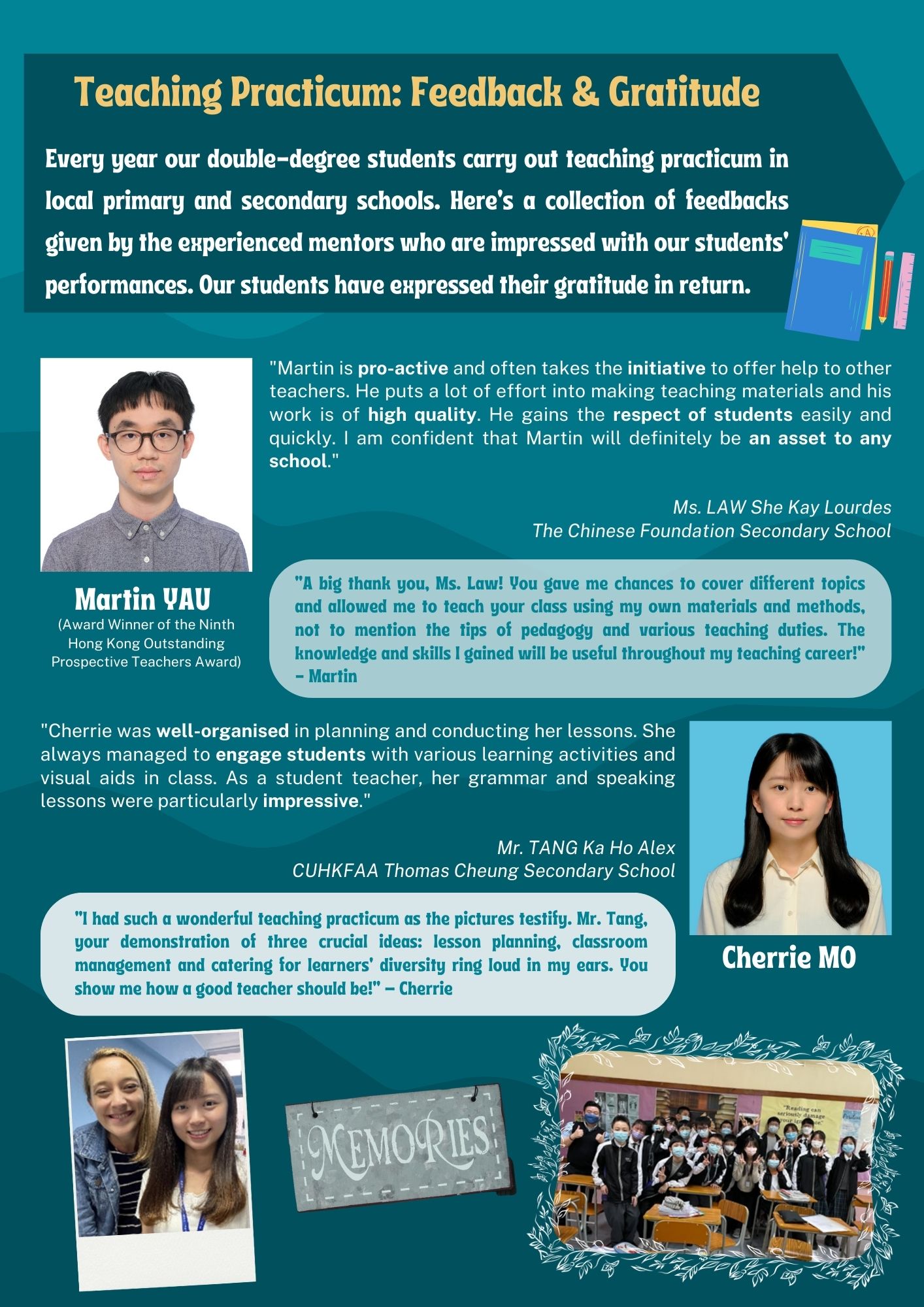 Every year our double-degree students carry out teaching practicum in local primary and secondary schools. Here’s a collection of feedbacks given by the experienced mentors who are impressed with our students’ performances. Our students have expressed their gratitude in return.