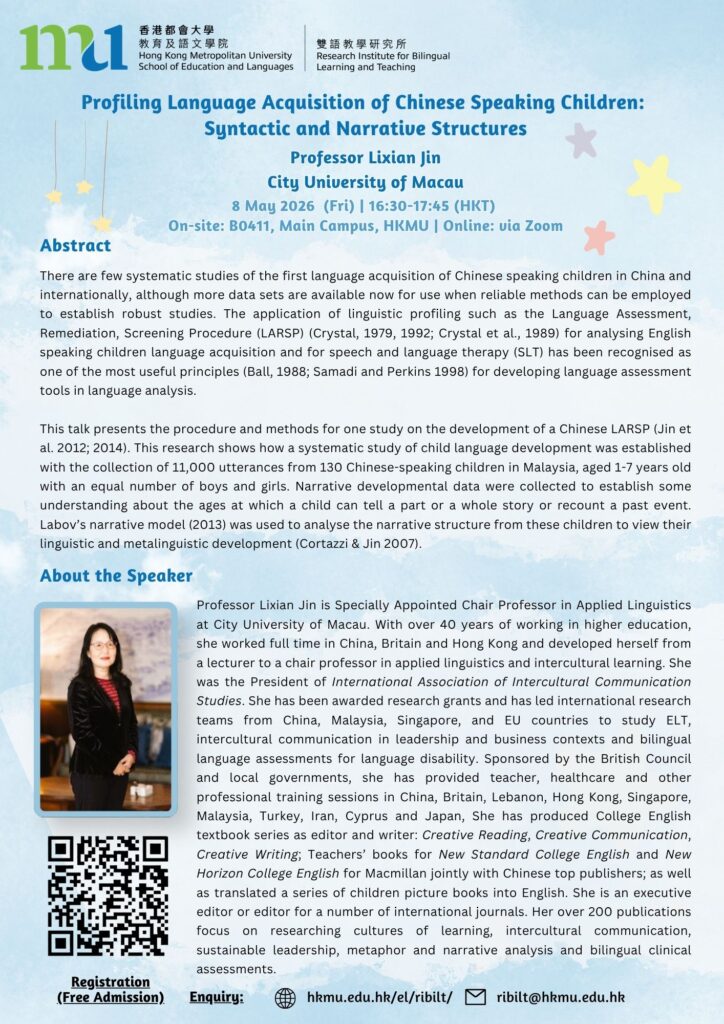 5 December 2025RIBiLT Webinar Series: Child Language DevelopmentWhat Counts? How Child Mandarin Informs the Countability DebateSpeaker: Prof. Aijun Huang Please click here for more details |