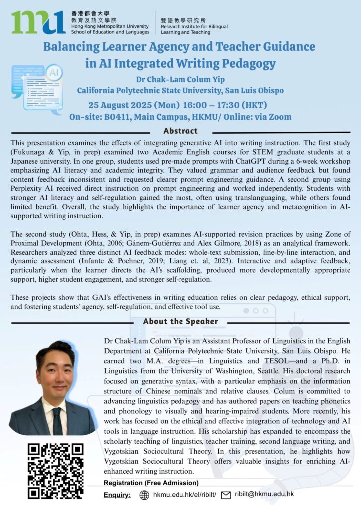 RIBiLT Seminar: Balancing Learner Agency and Teacher Guidance in AI Integrated Writing Pedagogy