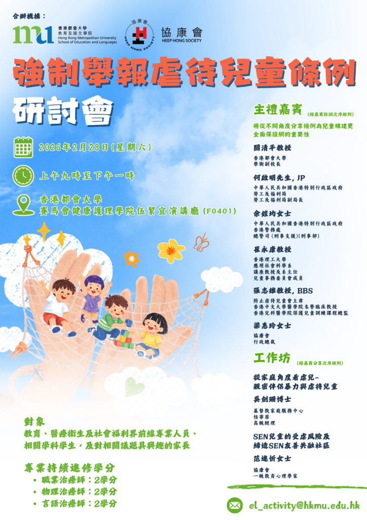 《強制舉報虐待兒童條例》(《條例》)(第650章)於2024年7月11日獲立法會通過,並於2026年1月20日實施。本研討會旨在增進參加者在辨識及舉報兒童虐待案件方面的知識與能力,以履行合相關的法律及道德責任。 參加者將學習實用技巧,以辨識身體、情緒及性虐待的特徵與指標、掌握舉報程序,並以專業及具同理心的態度支援受影響兒童及其家庭。