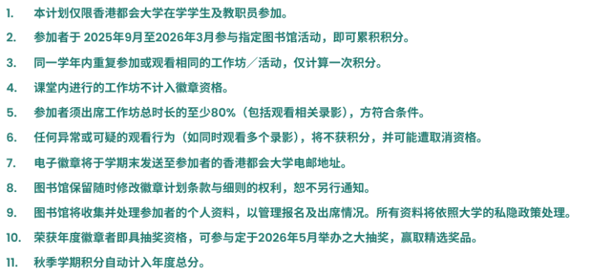 2025年9月-2026年3月参与指定图书馆活动,即可累积积分!总积分突破10分者,将荣获『研究达人2025/26年度徽章』,更可获得抽奖资格。秋季学期积分自动计入年度总分,每次参与皆累积优势,逐步接近年度荣誉!