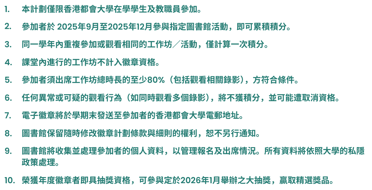 凡於 2025 年 9 月至 12 月期間參與符合條件的圖書館活動,將自動獲得相應積分。