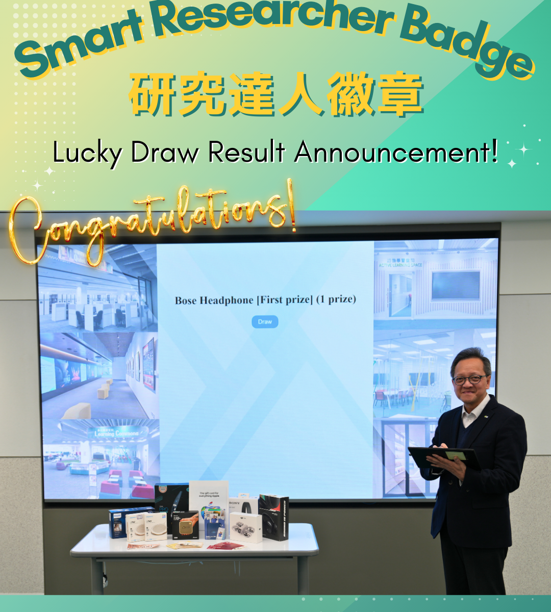 📚✨圖書館「研究達人徽章2025/26 - 秋季徽章」計劃已於2025年12月圓滿結束。 副校長(行政及機構發展) 鄺志良教授應邀擔任抽獎嘉賓,喺2026年1月8日為今次活動抽出各個奬項嘅得獎者。請掃瞄二維碼瀏覽得獎者名單,我哋將於稍後以電郵聯絡得獎者以安排領獎。 🎉恭喜所有得獎者,並再次感謝各位嘅支持!期待您繼續參與即將舉行嘅「研究達人2025/26年度徽章」計劃!🙌