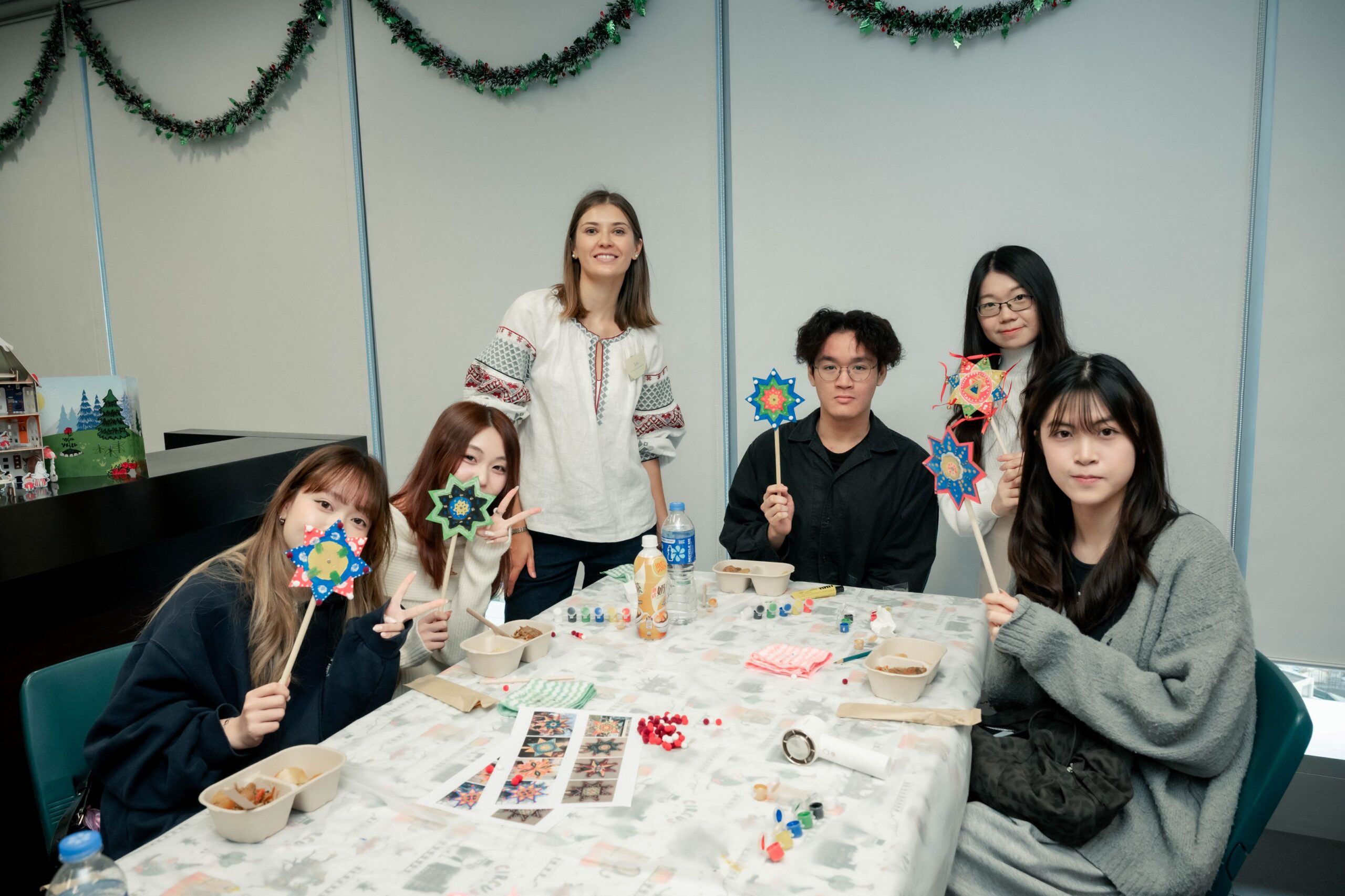 Following successful cultural events featuring Christmas traditions from the UK, the Philippines, Russia, Finland, Latin America, and Hungary, HKMU LiPACE is partnering with the Ukrainian community in Hong Kong to present the Christmas customs and traditions of the Orthodox Church. This collaboration provides students with the opportunities to experience Ukrainian cultural elements, including Vybiyka (fabric decoration) workshop, Zirka (Christmas Star) workshop, Vyshyvanka (traditional embroidered garments) display and traditional food-tasting.