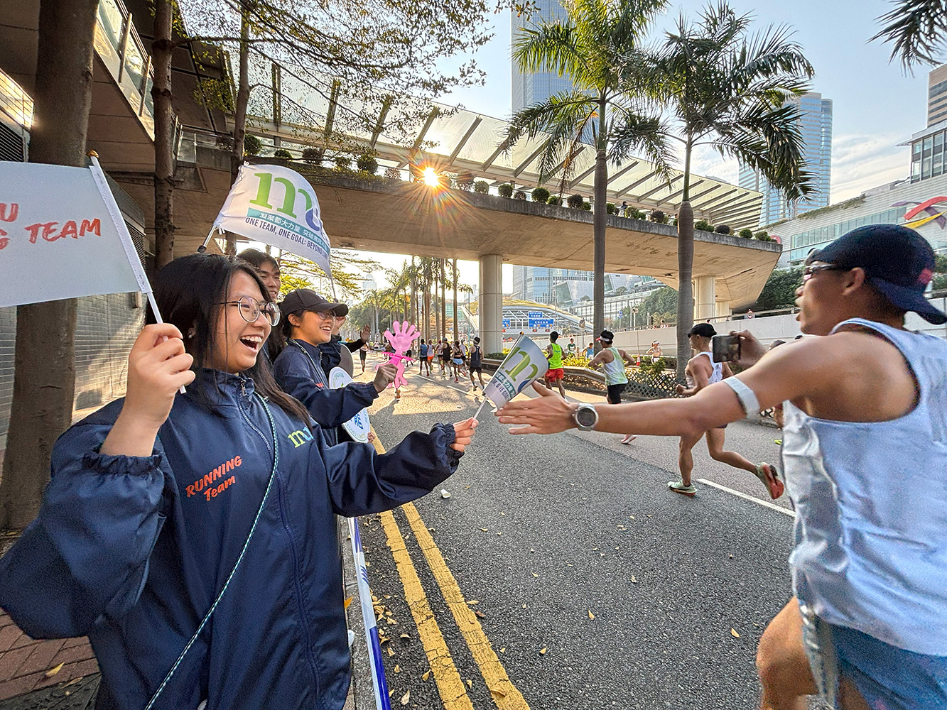 HKMU President Prof. Paul Lam Kwan-sing, Vice President (Administration and Corporate Development) Prof. Charles Kwong Che-leung and other senior management arrived at Victoria Park in Causeway Bay early in the morning to cheer on the HKMU runners. After the races, they congratulated the finishers and provided them with refreshments and energy drinks to aid in their recovery.