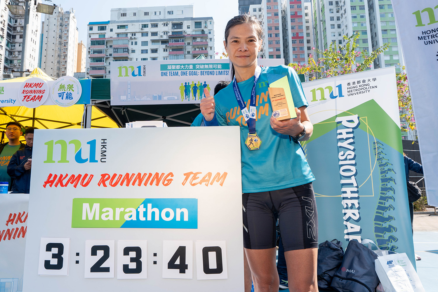 HKMU set up a booth at Victoria Park, staffed by the University's physiotherapy team, comprised of alumni and students, to offer professional treatment, post-race recovery support and consultations exclusively for HKMU runners. The booth also featured dedicated photo spots for finishers to capture their accomplishments.
