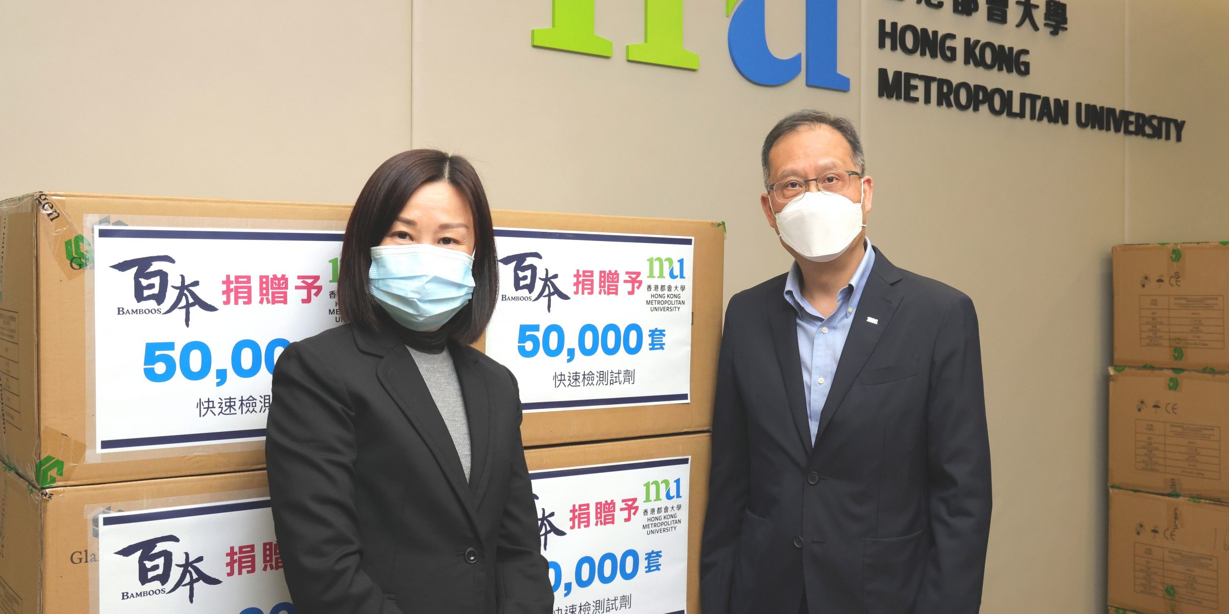 香港都會大學(都大)日前獲百本醫護控股有限公司(百本)慷慨捐贈50,000套快速抗原測試劑,以支持大學的抗疫工作。 都大校長林群聲教授衷心感