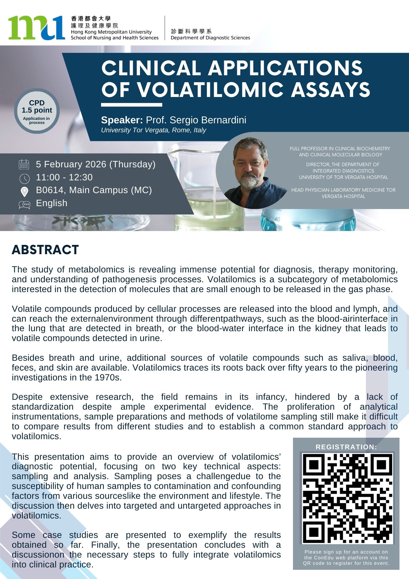 Prof Sergio Bernardini is the Chief of the Laboratory Medicine department (Tor Vergata Univeristy Hospital, Italy), Chair of the Emerging Technologies Division of International Federation of Clinical Chemistry and Laboratory Medicine (IFCC) and Full Professor in Clinical Biochemistry and Clinical Molecular Biology Head Physician of the Laboratory Medicine Units (University of Tor Vergata Hospital, Italy). This presentation aims to provide an overview of volatilomics' diagnostic potential, focusing on two key technical aspects: sampling and analysis. Sampling poses a challenge due to the susceptibility of human samples to contamination and confounding factors from various sourceslike the environment and lifestyle. The discussion then delves into targeted and untargeted approaches in volatilomics.