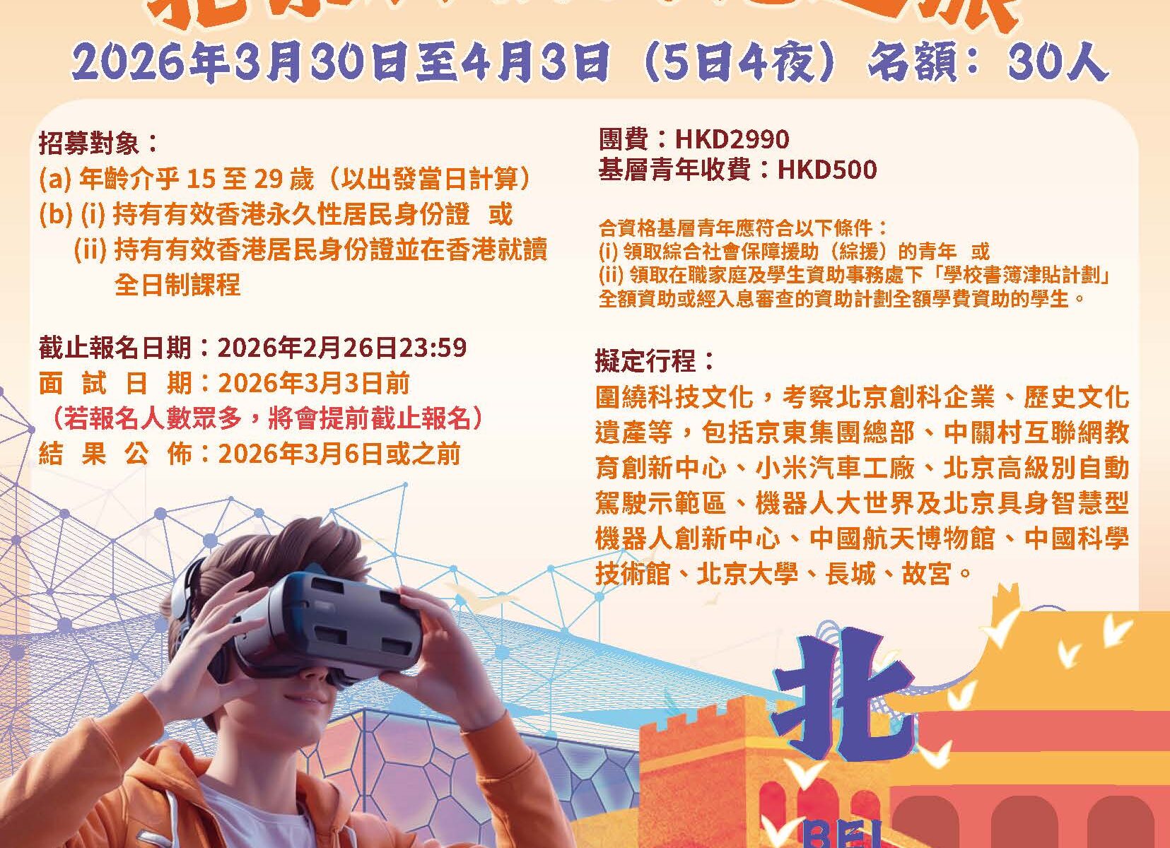 日期:2026年3月30日至2026年4月3日 (5日4夜) 對象: (a) 年齡介乎 15 至 29 歲(以出發前往北京當日計算) (b) (i) 持有有效香港永久性居民身份證 或 (ii) 持有有效香港居民身份證並在香港就讀全日制課程 名額:30人 (如有需要,本會將進行面試) 費用:一般青年HKD2990;基層青年HKD500 截止報名: 2026年2月26日23:59(若報名人數眾多,將會提前截止報名) 報名連結:https://forms.gle/5Gkzhkui252ApNNE6(或透過海報上的二維碼報名) 擬定行程:考察京東集團總部、中關村互聯網教育創新中心、小米汽車工廠、北京高級別自動駕駛示範區、機器人大世界及北京具身智慧型機器人創新中心、中國航天博物館、中國科學技術館、北京大學、長城、故宮等。