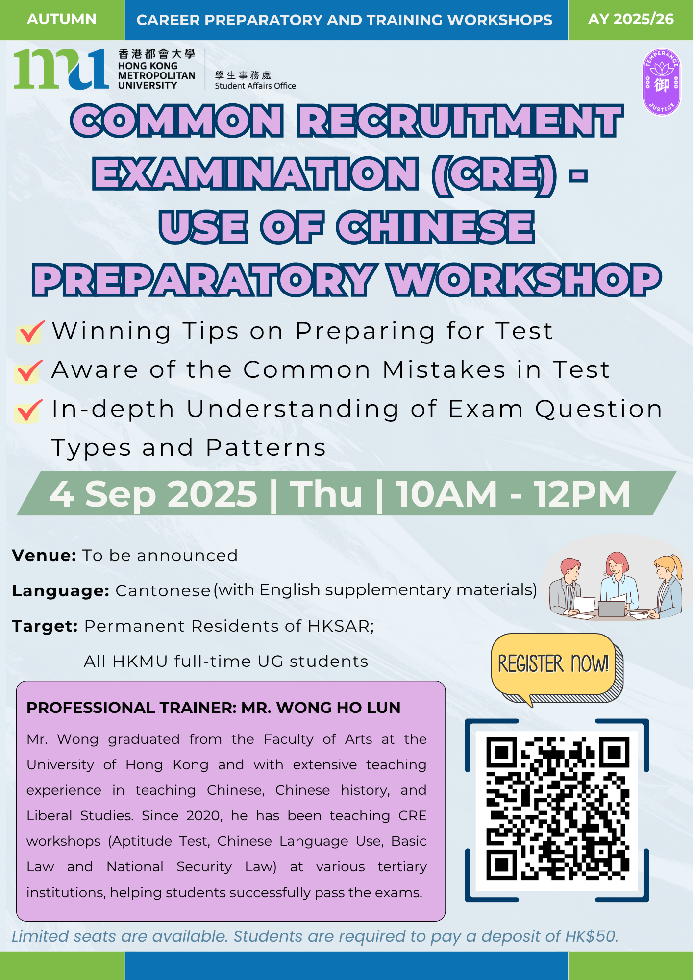 4 Sep 2025 (Thu) | Common Recruitment Examination (CRE) - Use of Chinese Preparatory Workshop | Face-to-face | 10:00am- 12:00 pm | Full-time Undergraduate Students | Cantonese | Hard skills/ Job hunting skills | Mr. Wong Ho Lun | 30 | Closed |