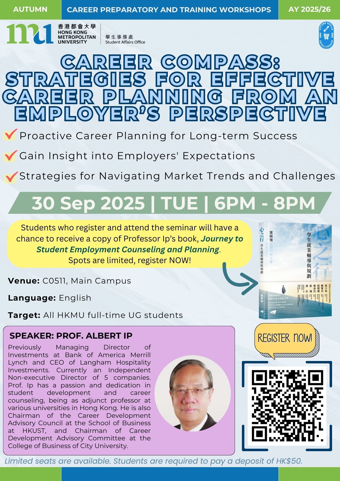 30 Sep 2025 (Tue) | Career Compass: Strategies for Effective Career Planning from an Employer's Perspective | Face-to-face | 6:00pm-8:00pm | Full-time Undergraduate Students | English | Career exploration/ Career Sharing | Prof. Albert Ip | 30 | Closed |