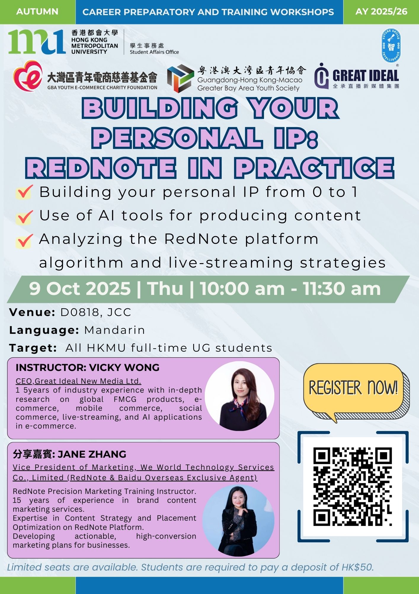 9 Oct 2025 (Thu) | Building Your Personal IP: RedNote in Practice | Face-to-Face | 10:00am-11:30 pm | Full-time Undergraduate Students | Mandarin | Soft skills/ Career exploration | Ms. Vicky Wong / Ms. Jane Zhang | 30 | Closed |