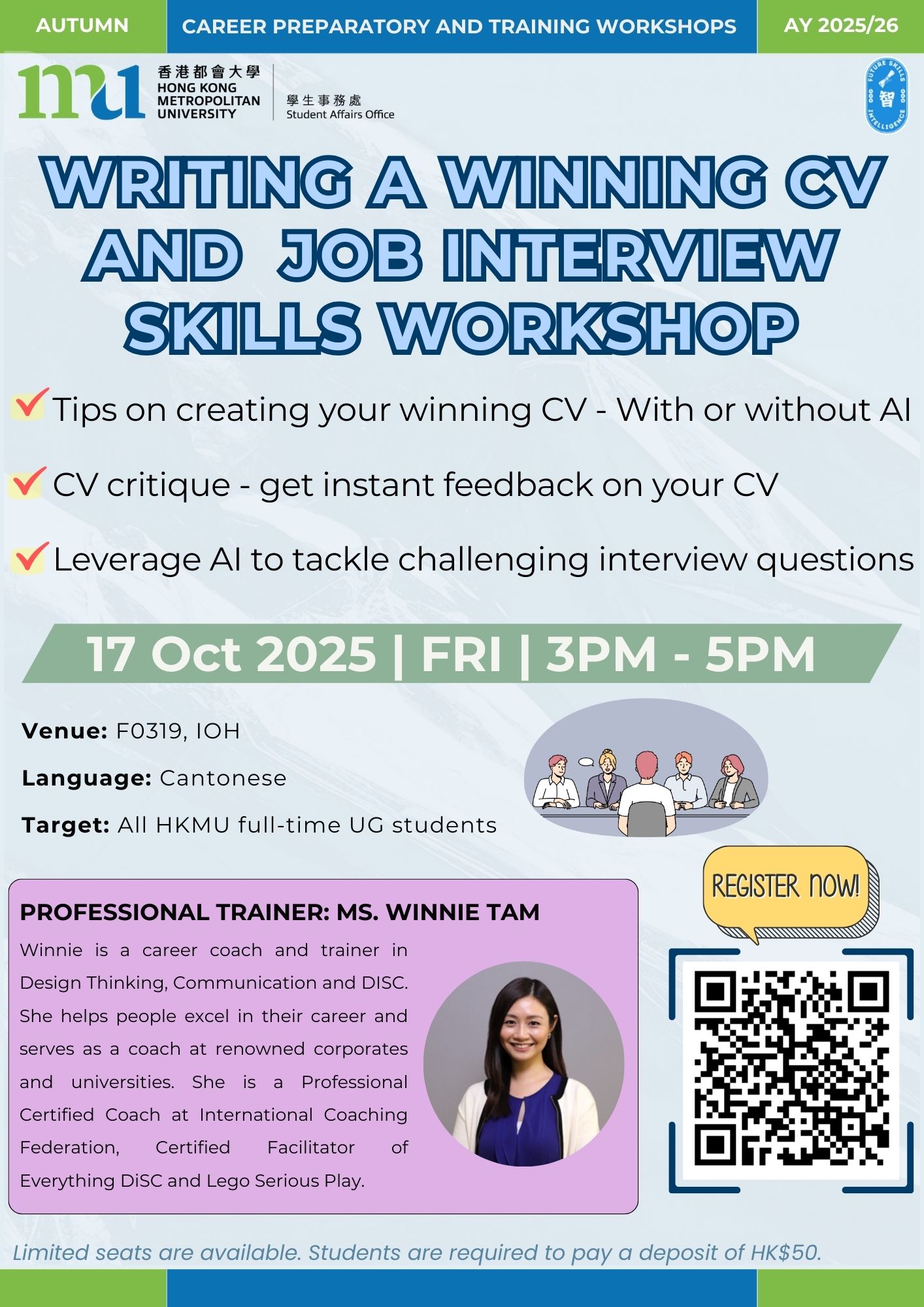 17 Oct 2025 (Fri) | Writing a Winning CV and Job Interview Skills Workshop | Face-to-face | 3:00pm - 5:00pm | Full-time Undergraduate Students | Cantonese | Hard skills/ Job hunting skills | Ms. Winnie Tam | 30 | Closed |