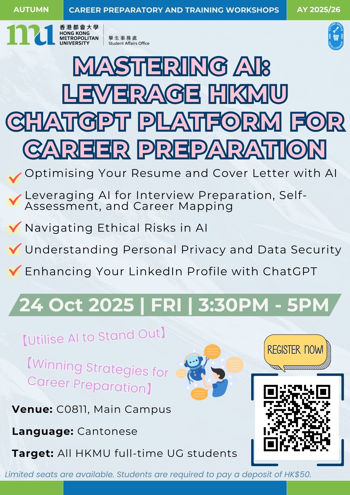 24 Oct 2025 (Fri) | Mastering AI: Leverage HKMU ChatGPT Platform for Career Preparation | Face-to-face | 3:30pm - 5:30pm | Full-time Undergraduate Students | Cantonese | Up-to-date information/ Job hunting Tips | SAO & ITO | 30 | Closed |