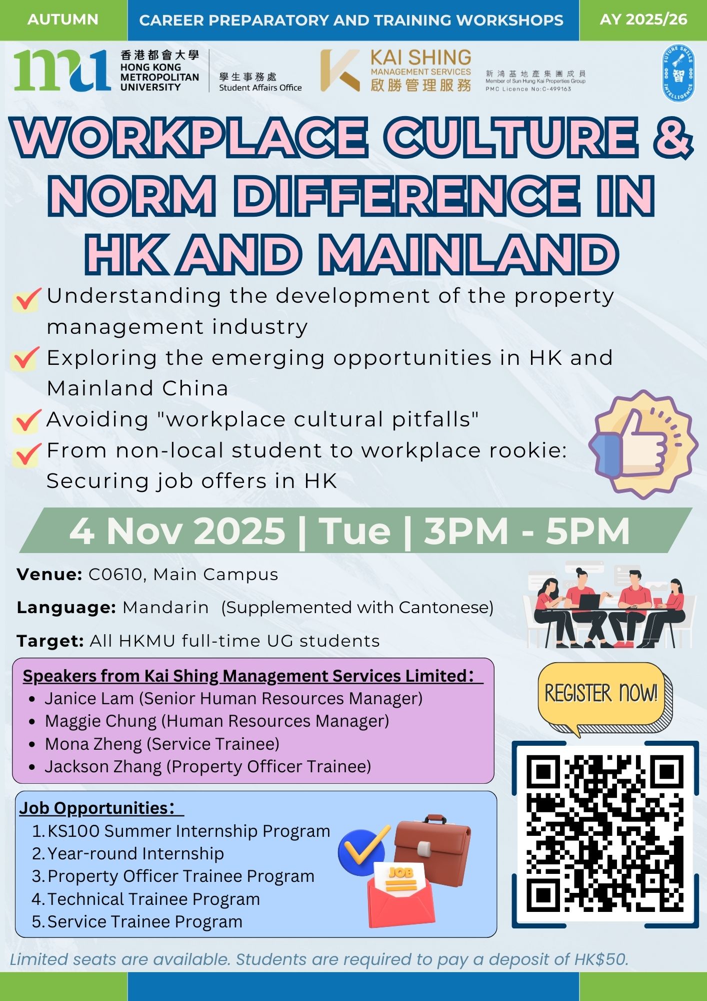 4 Nov 2025 (Tue) | Workplace Culture & Norm Difference in HK & Mainland | Face-to-face | 3:00pm - 5:00pm | Non-local Full-time Undergraduate Students | Mandarin | Hard skills/ Job hunting skills | Kai Shing Management Services Limited | 30 | Closed |