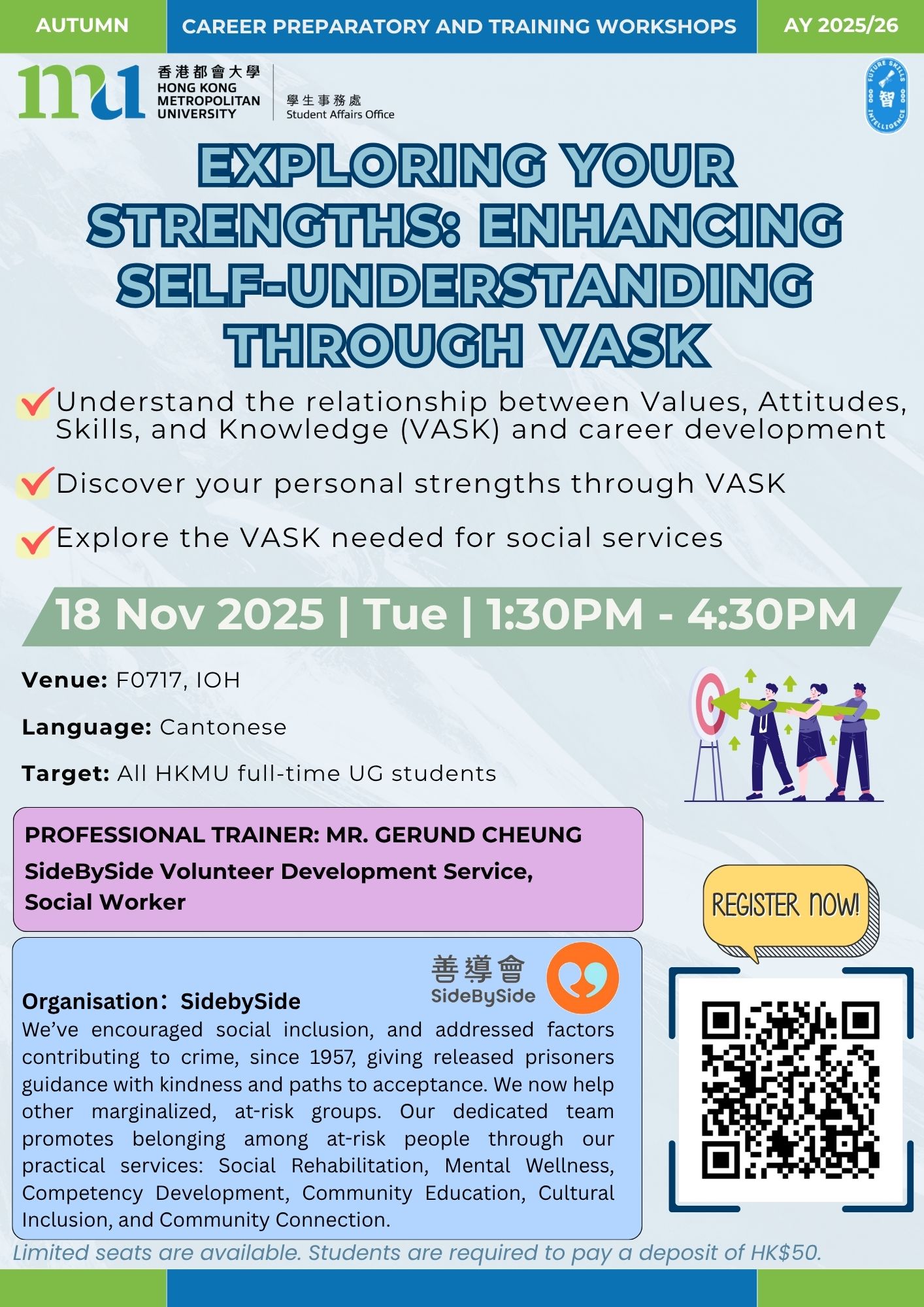 18 Nov 2025 (Tue) | Exploring Your Strengths: Enhancing Self-understanding by VASK | Face-to-face | 1:30pm - 4:30pm | Full-time Undergraduate Students | Cantonese | Soft skills/ Career exploration | SidebySide | 30 | Closed |