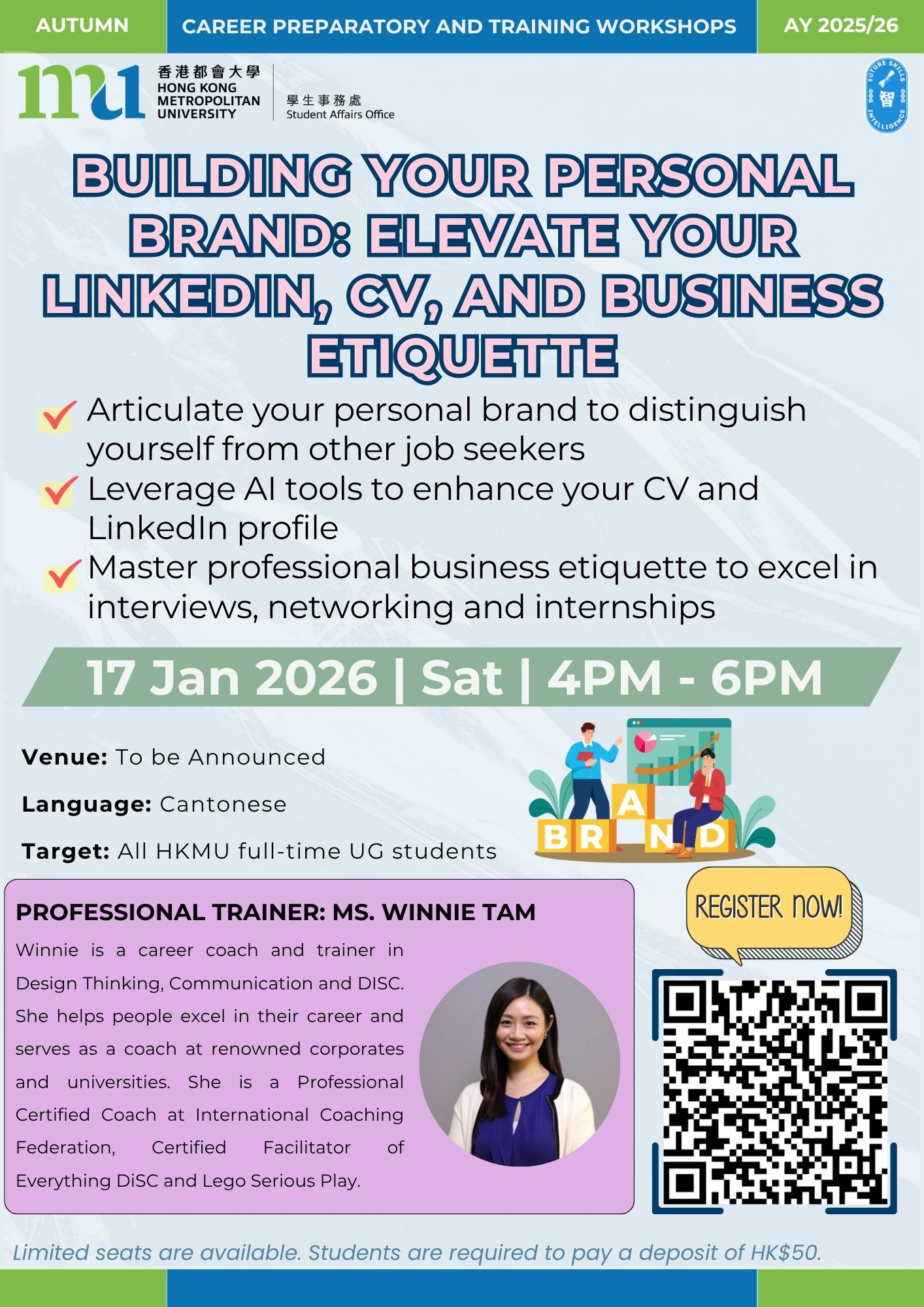 17 Jan 2026 (Sat) | Building Your Personal Brand: Elevate Your LinkedIn, CV, and Business Etiquette | Face-to-face | 4:00pm - 6:00pm | Full-time Undergraduate Students | Cantonese | Hard skills/ Job hunting skills | Ms. Winnie Tam | 30 | Click here |