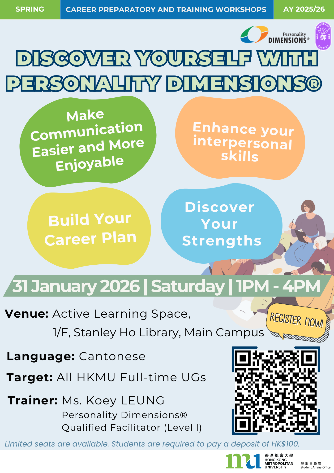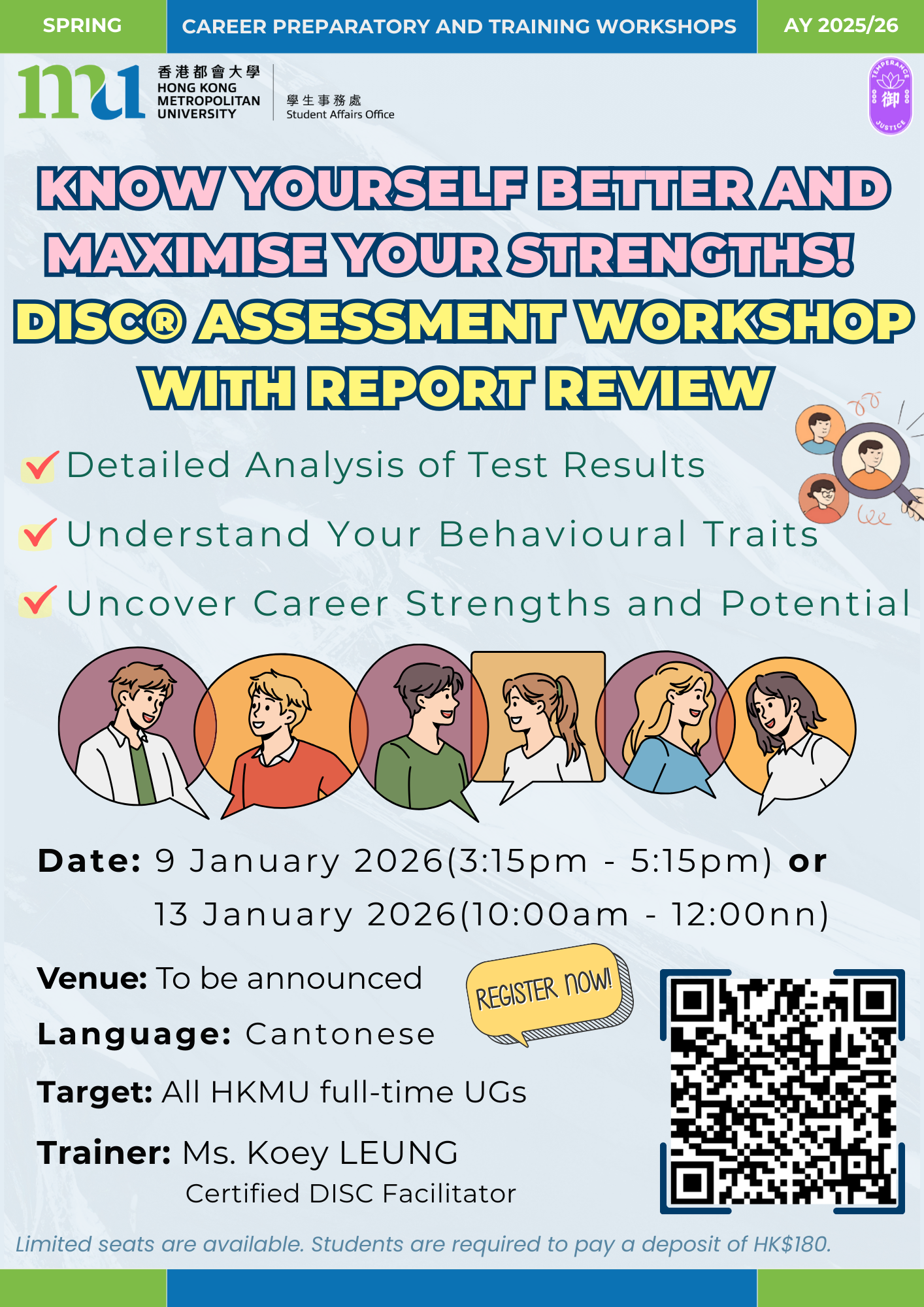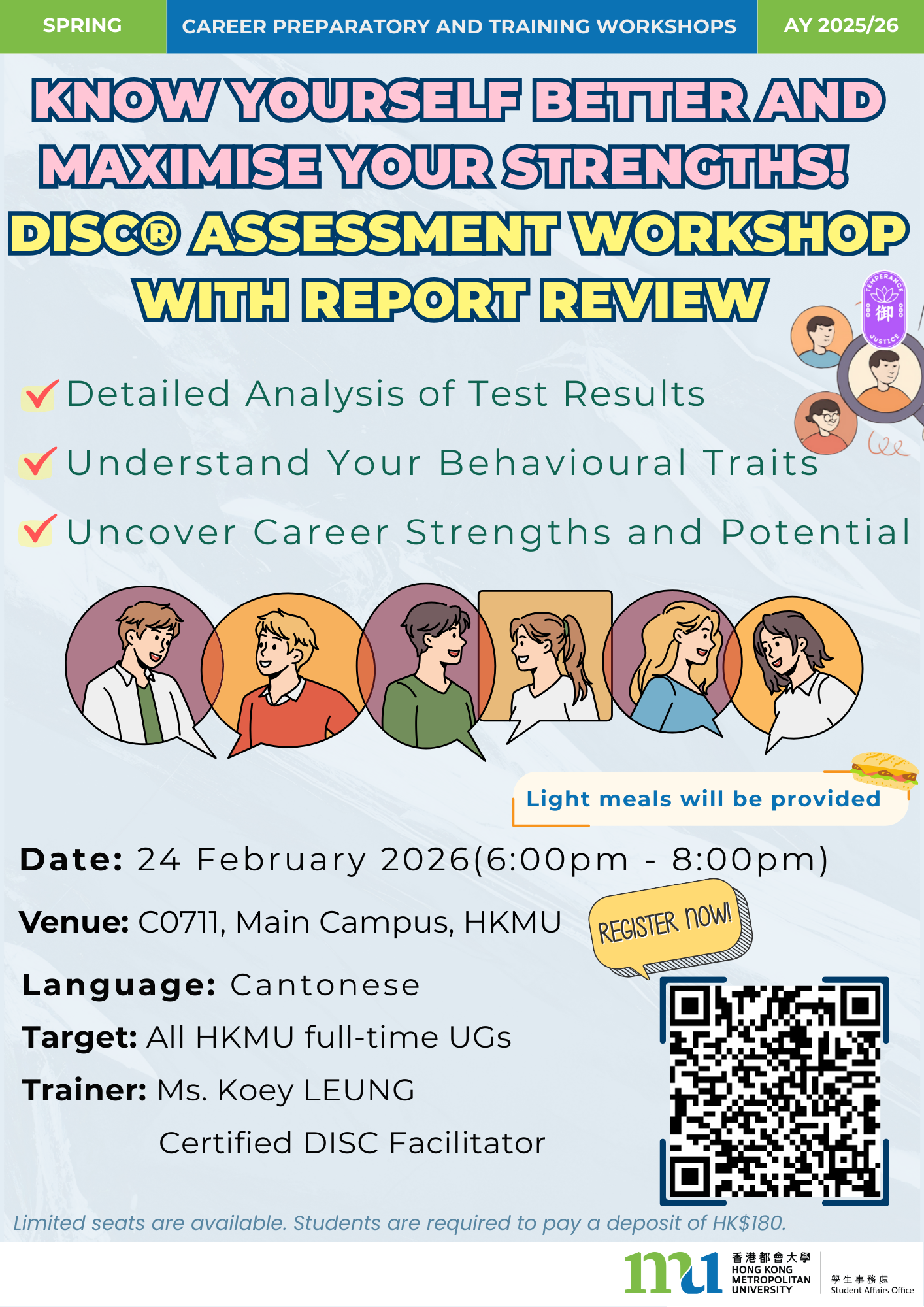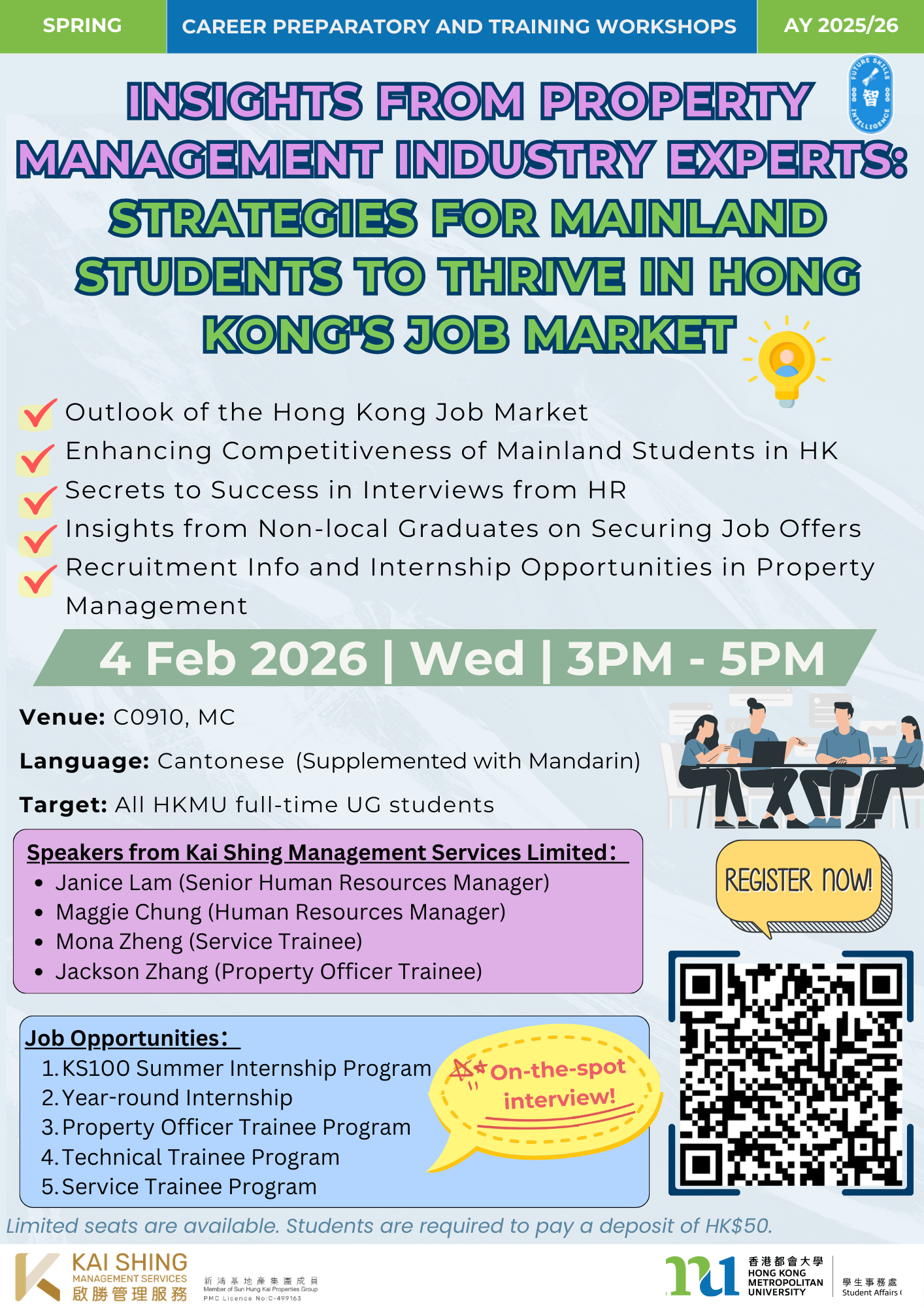 All HKMU students are invited to attend our Career Preparatory and Training Workshops. The sessions will cover a variety of essential topics to support students’ professional development, including career and personal value assessment, training on applying for government jobs, developing effective job hunting skills/hard skills, opportunities for job shadowing, preparing for AI in business, etc. Priority will be given to full-time undergraduate students of the University.
