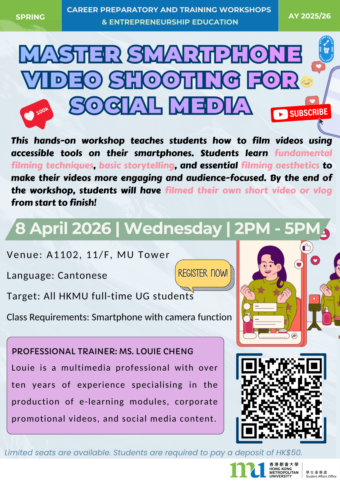 8 April 2026 (Wed) | Master Smartphone Video Shooting for Social Media | Face - to - face | 2:00pm - 5:00pm | Full-time Undergraduate Students | Cantonese | Hard skills/ Personal branding | Ms. Louie Cheng | 30 | Click here |