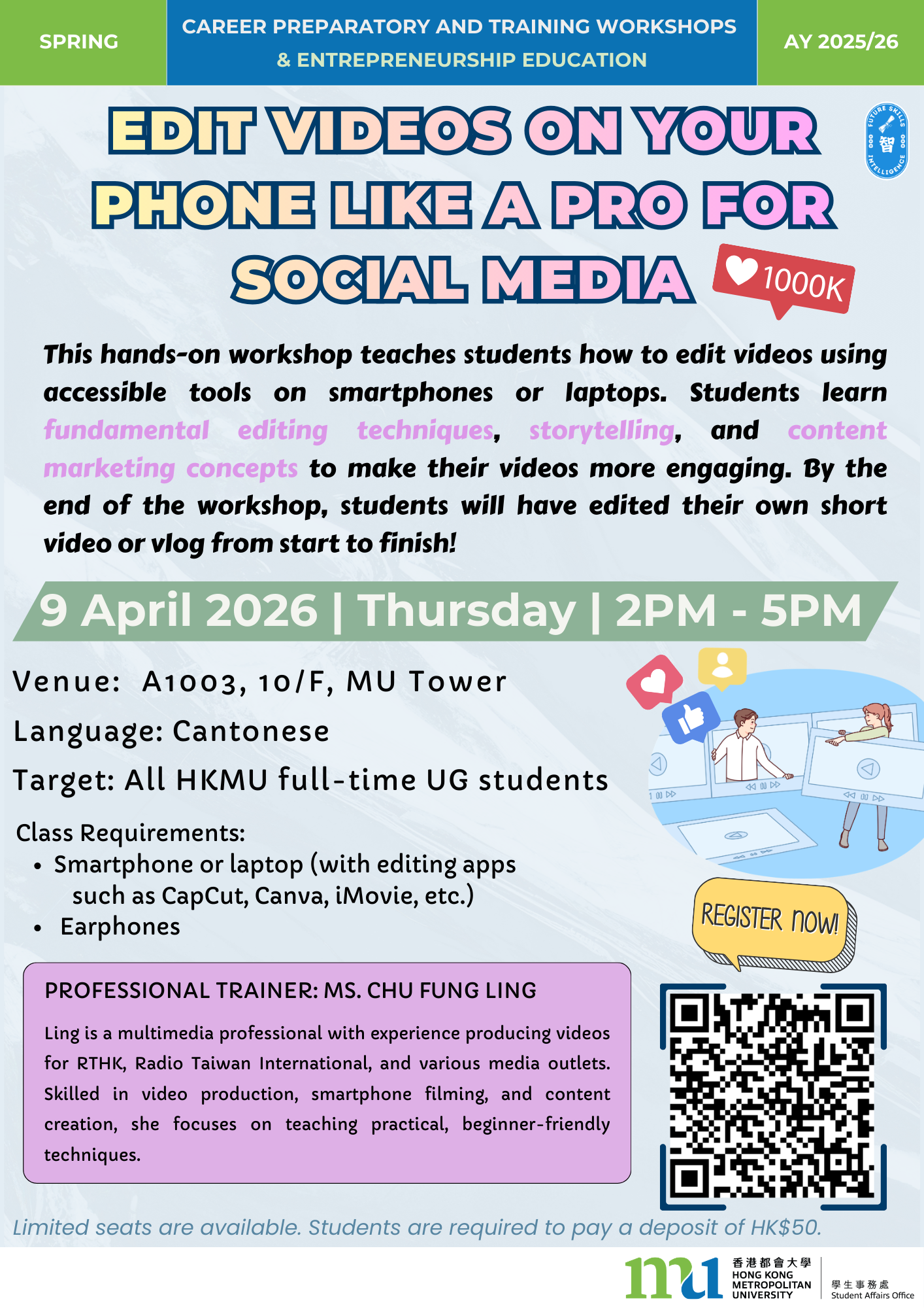 9 April 2026 (Thu) | Edit Videos on Your Phone Like a Pro for Social Media | Face-to-face | 2:00pm - 5:00pm | Full-time Undergraduate Students | Cantonese | Hard skills/ Personal branding | Ms. Chu Fung Ling | 30 | Click here |