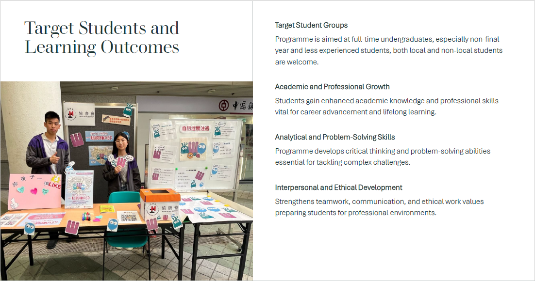 Various short-term project-based work opportunities with partner employers are designed for students to gain hands-on working experience and in-depth understanding of the host organization. More importantly, students would have a taste of career development in different industries.