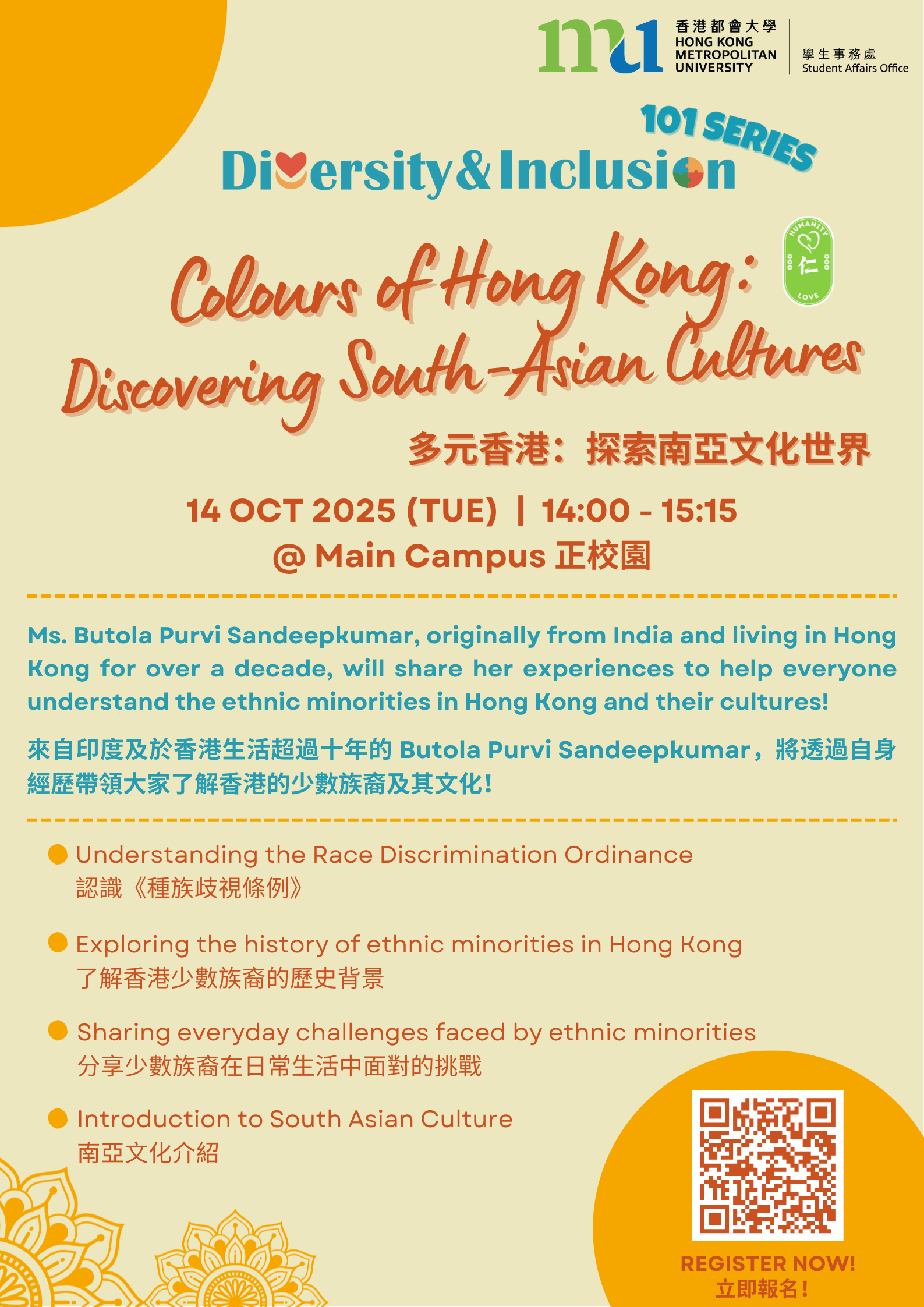 The D&I 101 Series, taking place from September to October, will offer four different sessions designed to help you understand the fundamentals of D&I by exploring its key concepts and real-life applications. The series will kick off with an introductory workshop on what D&I is, followed by three sessions focusing on two core dimensions: (1) Racial Inclusion and (2) Special Educational Needs (SEN). After participating, you will gradually gain a deeper understanding of diversity and inclusion (D&I), gain insights into the diverse communities in Hong Kong, and learn to appreciate differences across cultures and backgrounds.