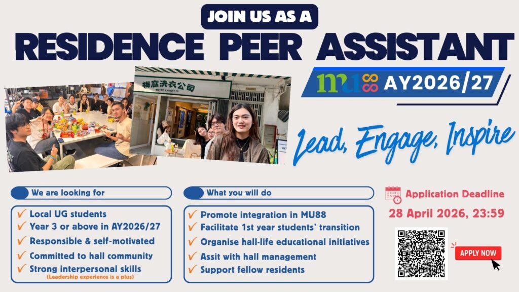 The Residence Peer Assistant (RPA) Scheme aims to recruit senior local students who demonstrate strong interest and potential to be trained as peer leaders. Through structured training and ongoing support, RPAs will play a key role in fostering a supportive, inclusive and educational hall environment, particularly in assisting first-year students in adapting to university and hall life at HKMU, as well as to life in Hong Kong under the hall-based residential education system.