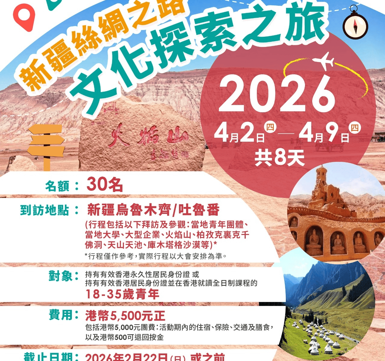 主辦機構民主建港協進聯盟 (民建聯)、青年民建聯合辦機構青年同心協會有限公司贊助機構民政及青年事務局、青年發展委員會計劃內容新疆是中華文明的重要組成部分,作為古絲綢之路的關鍵節點,承載了深厚的歷史底蘊和多元文化。除了以維吾爾族為代表的民族文化和風味獨特的飲食文化聞名全國外,新疆在歷史文化遺產保護、自然生態保育以及現代城市與經濟發展方面同樣具有重要意義,值得深入探索。民建聯舉辦「新疆絲綢之路文化探索之旅2026」,旨在促進香港與內地交流,讓參加者深入了解新疆的自然景觀、體驗歷史文化及現代發展,增強國民身份認同並拓寬視野。到訪地點新疆:烏魯木齊及吐魯番 行程包括以下拜訪及參觀:當地青年團體、當地大學、大型企業、火焰山、柏孜克裏克千佛洞、天山天池、庫木塔格沙漠等**行程僅作參考,實際行程以大會安排為準。日期2026年4月2日(四)至4月9日(四) (8天)參加資格 參加者須為18-35歲(以出發前往內地當日計算);並持有有效香港永久性居民身份證 或持有有效香港居民身份證並在香港就讀各大專院校全日制課程之學生名額30人費用(合共:港幣5,500元):*1. 港幣5,000元 (團費包括活動期內的住宿、保險、交通及膳食)2.按金: 港幣500元正(按金將在參與回港分享會後退回**)*是次交流團獲「2025-26年度民青局青年內地交流資助計劃」之基層青年境外交流資助試行計劃涵蓋。合資格的基層青年需自付一共港幣1,000元 ($500團費及$500按金) 即可參團。**按金退回安排:參加者必須在收到入選通知後,於指定日期前繳交團費及按金(共港幣5,500元正),並須履行下列要求及沒有違反規定下,方可取回全數按金(港幣500元正),否則將不獲退:1. 參加者必須出席所有交流活動相關的配套活動及履行參加者責任,包括團前簡介會、回港分享會;2. 參加者必須遵守各項參加者守則;3. 於指定日期前遞交個人及小組感想報告;4. 提交一切有關是次交流計劃所需的文件申請方法於2026年2月22日(日)或之前透過以下連結報名:https://forms.dab.org.hk/eform/ydab/20260402-0409/查詢電郵: youngdab@dab.org.hk電話: 3582 1164(劉先生)、3582 1130(張先生)