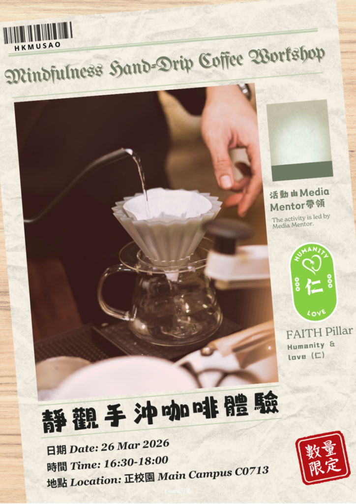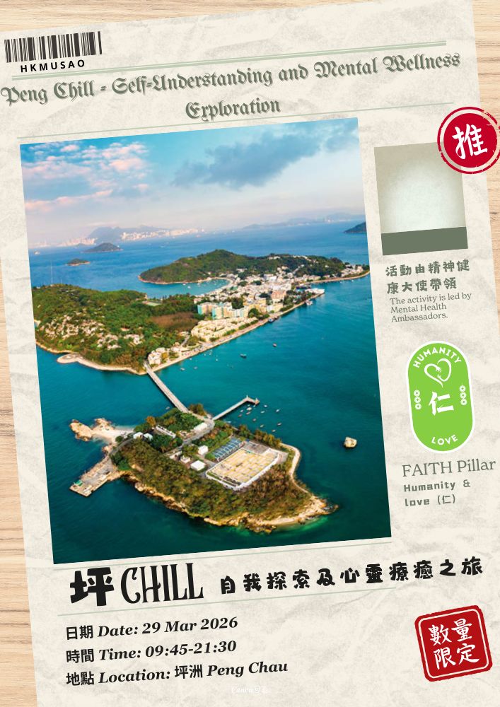 This activity is a one-day experiential trip outside the campus, taking place on Peng Chau. The itinerary is fully planned by the Mental Health Ambassadors (MHAs), allowing participants to reconnect with nature while becoming more aware of their own emotions and thoughts. The programme will be guided through mindfulness and five-senses experiences as key entry points. For more details, please refer to the registration form.