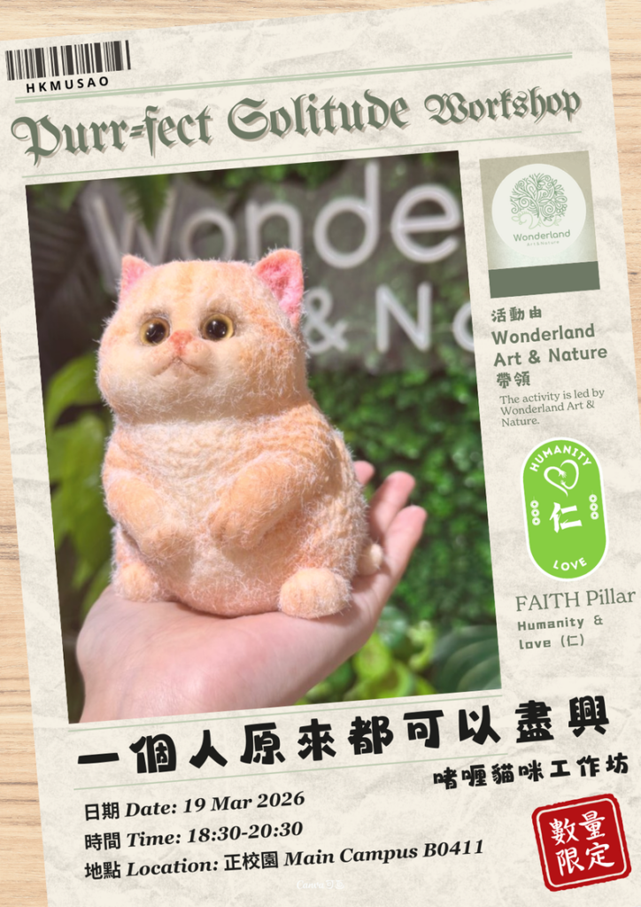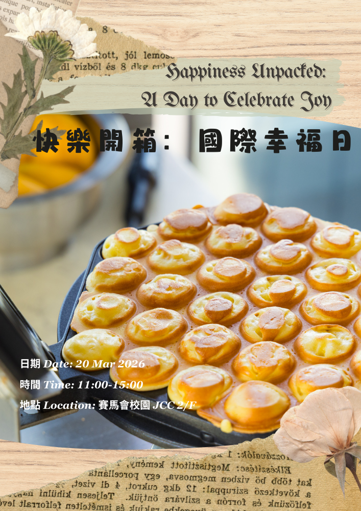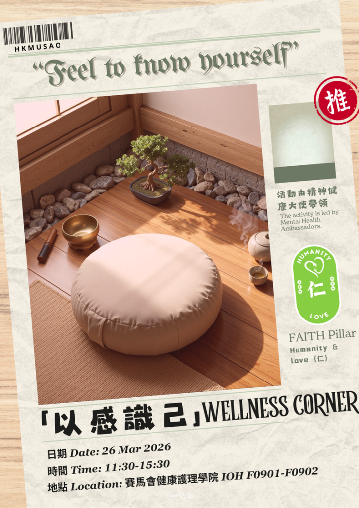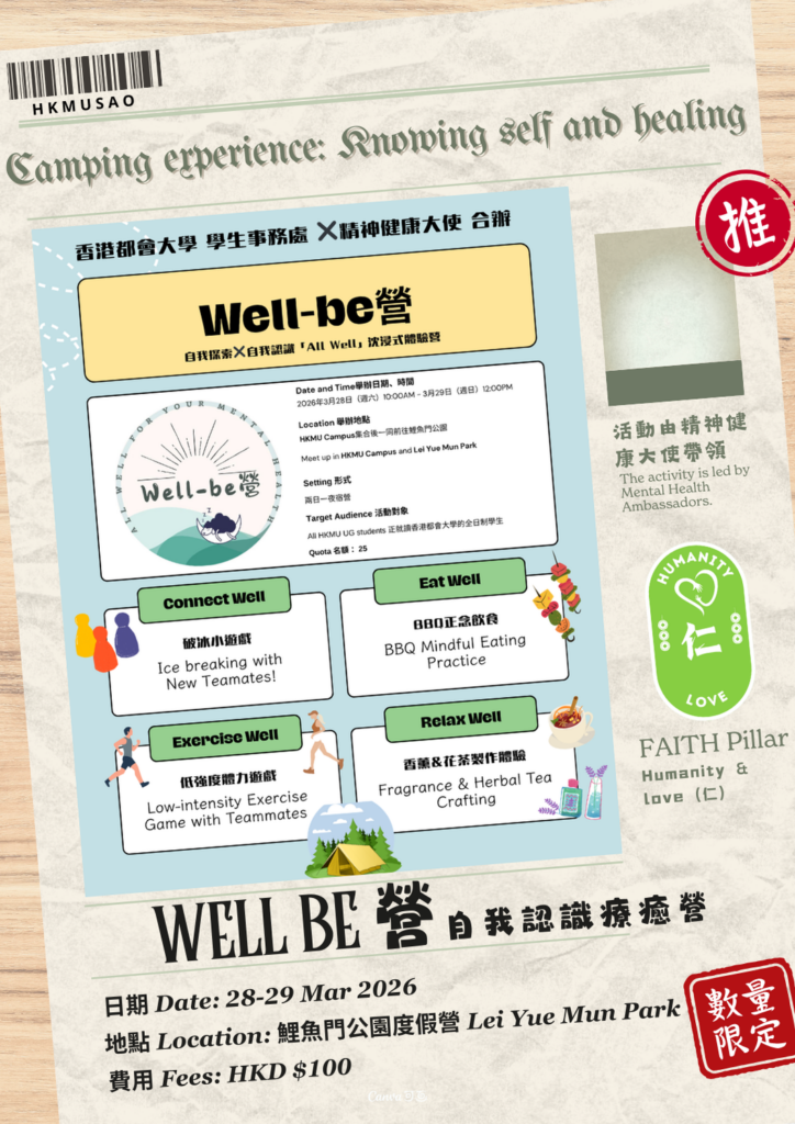 Hong Kong Metropolitan University's “Soul-Wellness” Campaign (“好療癒”行動) promotes mental well-being through a series of workshops, outreach events and support services. It aims to enhance emotional awareness, build resilience, and foster a compassionate, supportive campus culture where students and staff feel connected, cared for, and empowered to seek help when needed. This year, under the theme of "Self-Understanding," we invite you to join a series of healing experiences to explore your inner world and find the feeling of the here and now.