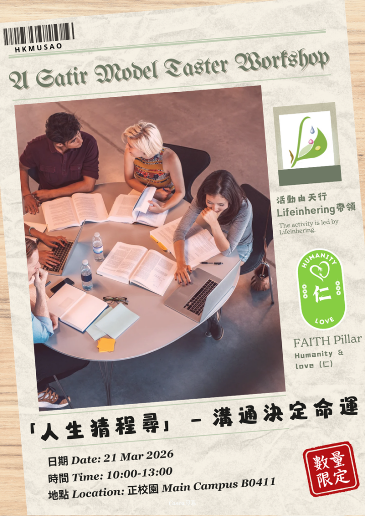 This workshop introduces the Satir Model, with a focus on using the “Iceberg Theory” to explore the deeper structures behind human behavior and emotions. Participants will learn strategies to develop congruent communication in order to strengthen their relationship-building skills. The target group is 20–30 full-time undergraduate students in the Mental Health Ambassador Programme, with the aim of enhancing interpersonal understanding and connection.