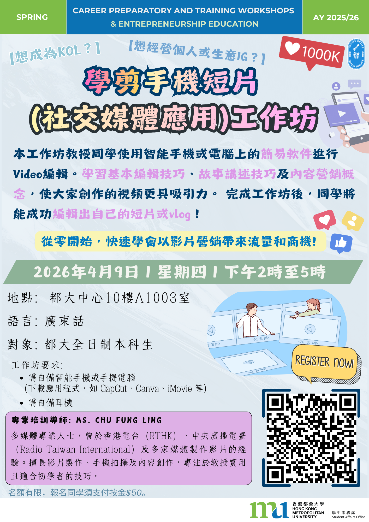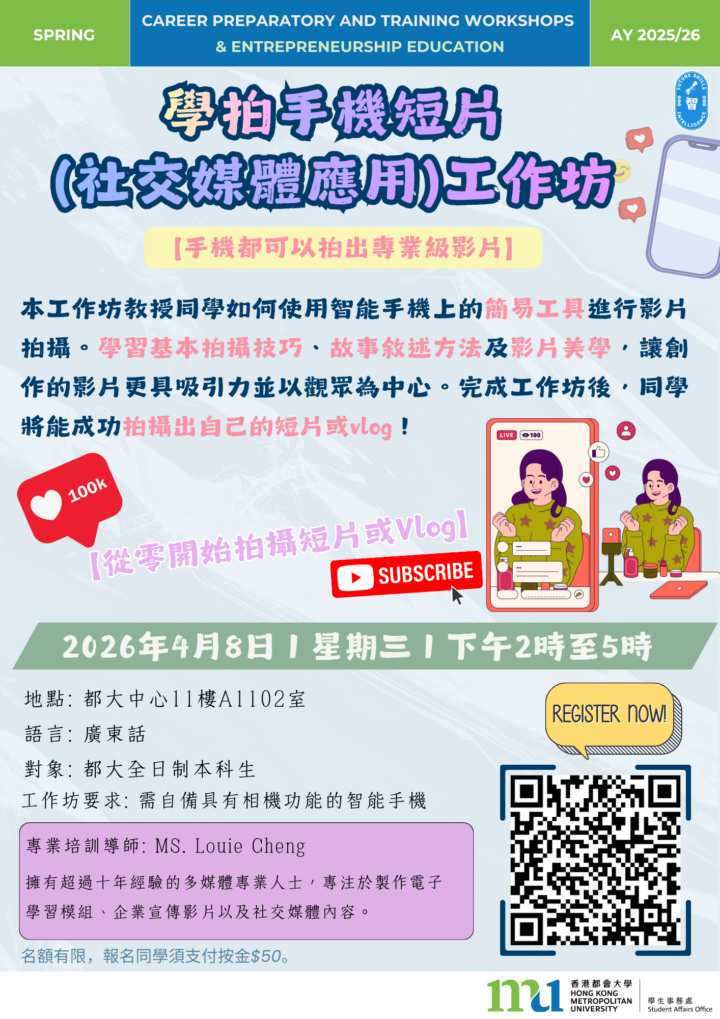 歡迎都大同學仔參加由我們職業發展及創業組籌劃的就業準備及培訓工作坊,工作坊主題包括職業及性格測試、政府工應聘培訓、學習求職技巧及硬技能、影子工作活動、人工智能於商業中的應用等等。工作坊名額有限,全日制本科生將獲優先考慮。