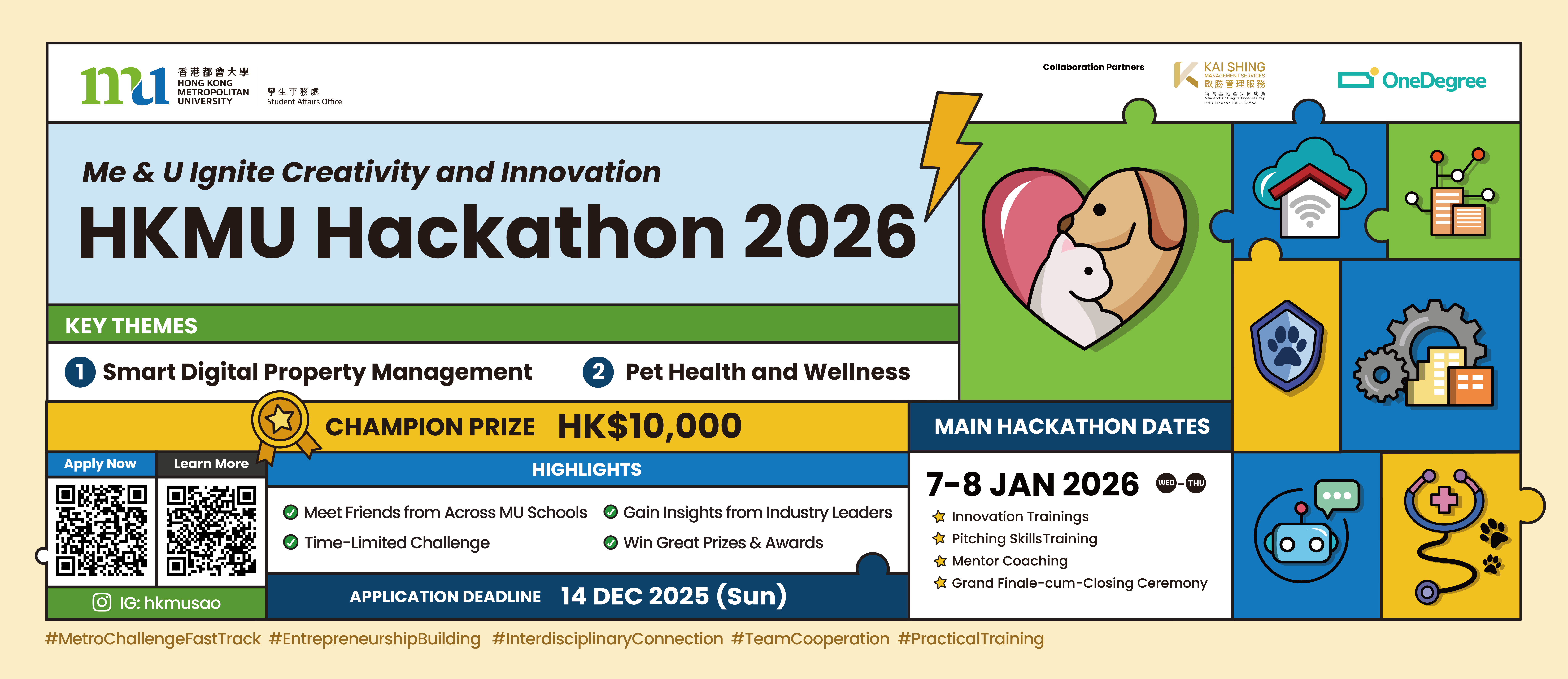 對香港都會大學而言,我們的Hackathon並非專注於科技,而是希望學生基於業界合作夥伴提供的問題陳述,以結構性的思维和有趣實用的方式解決問題,培養創意和創新能力。透過引人入勝的Hackathon賽前活動、啟發性的公司參觀以及主活動期間的實踐創新培訓,參加者將獲得寶貴的技能和信心,激發他們對創新的熱情,開展創業之旅。