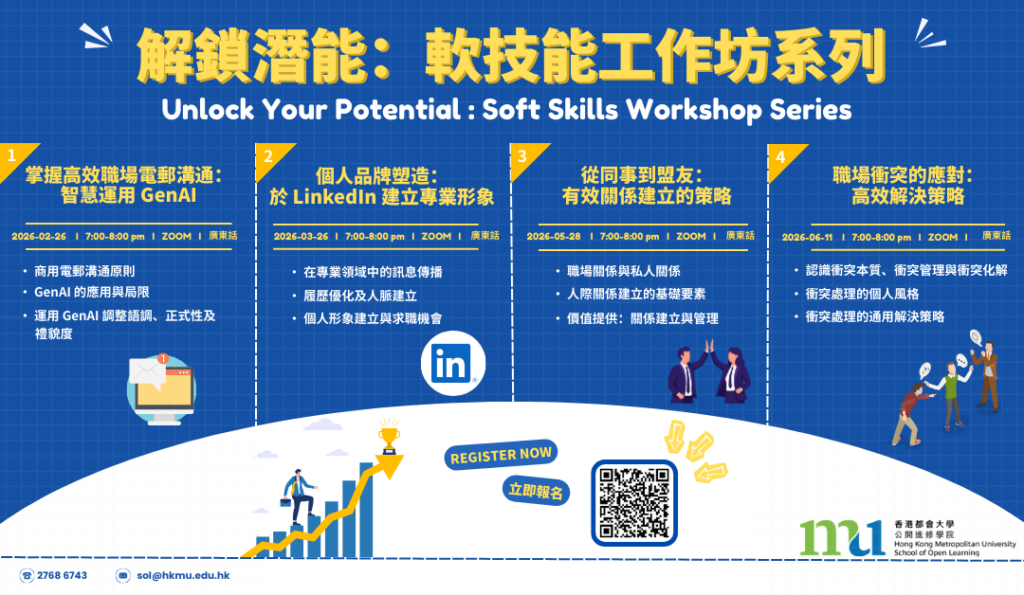 公开进修学院特别推出「解锁潜能:软技能工作坊系列」,助你掌握关键软技能,全面提升职场竞争力!