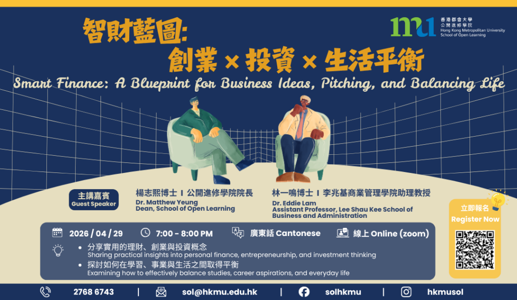 公开进修学院将举办「智财蓝图:创业 × 投资 × 生活平衡」工作坊,诚邀院长杨志熙博士李兆基商业管理学院助理教授林一鸣博士以对谈形式,分享实用的理财、创业与投资概念,并探讨如何在学习、事业与生活之间取得平衡,协助同学建立更清晰而可持续的进修与人生方向。