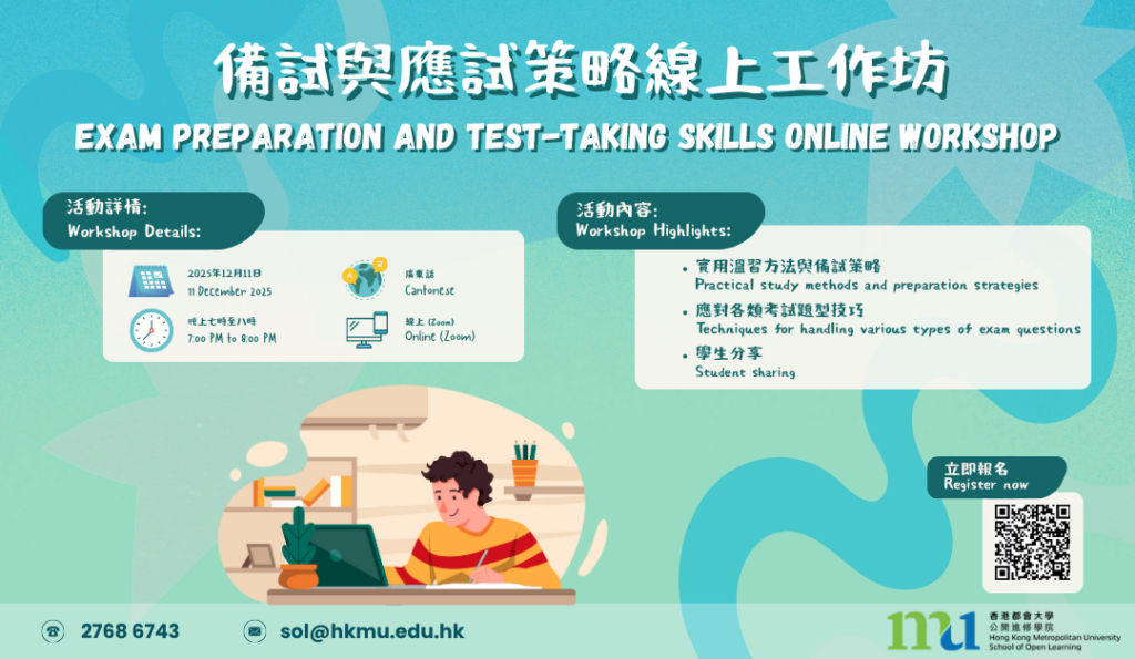 考試臨近,為協助大家提升溫習效率及應試表現,公開進修學院特別舉辦「備試與應試策略線上工作坊」,助你更有系統地準備考試,從容應對挑戰!