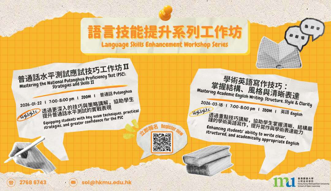 新的學期就快開始了,公開進修學院將繼續推出「語言技能提升系列工作坊」,透過實用的策略與技巧分享,幫助同學有效加強英語及普通話能力,提升語言運用的自信與表現。 請按此報名。 工作坊詳情如下: 1. 普通話水平測試應試技巧工作坊II 日期 2026年1月22日 (星期四) 時間 晚上7時正至8時正 語言 普通話 模式 線上 (Zoom) 內容 透過更深入的技巧與策略講解,協助學生提升普通話水平測試的實戰表現 截止報名日期 2026年1月15日 (星期四) 2. 學術英語寫作技巧:掌握結構、風格與清晰表達 日期 2026年3月18日 (星期三) 時間 晚上7時正至8時正 語言 英語 模式…