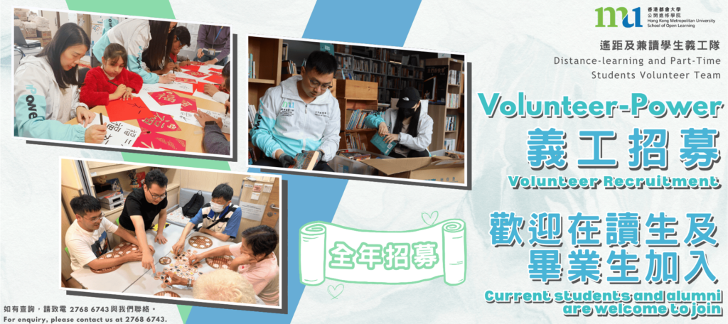 香港都會大學公開進修學院全年招募「Volunteer-Power 義工隊」成員,歡迎有志參與服務學習及義工活動的遙距及兼讀制課程學生加入。成為成員後,可定期收到專屬資訊及參與以下活動: