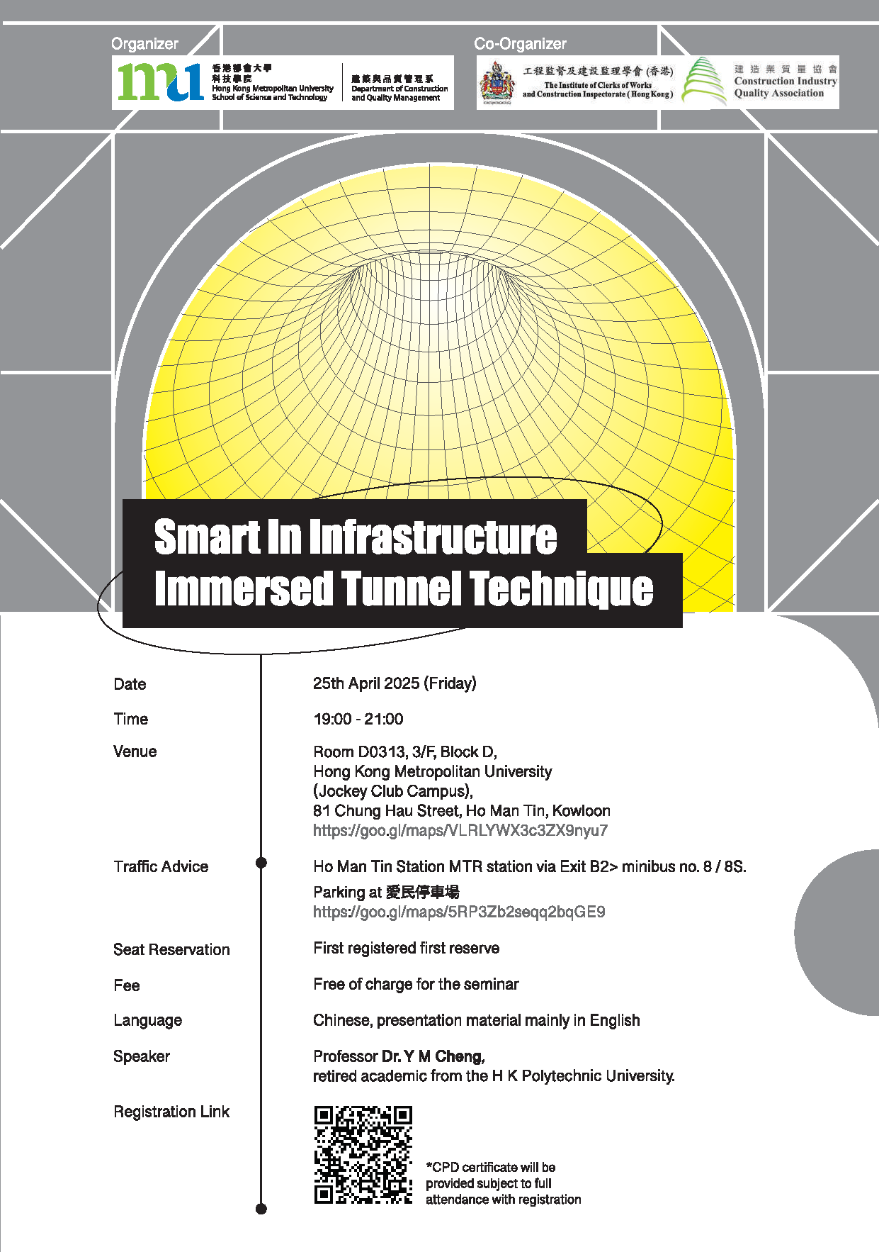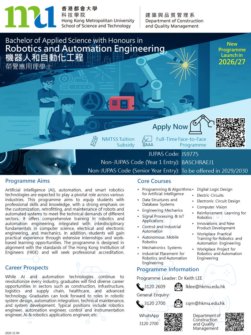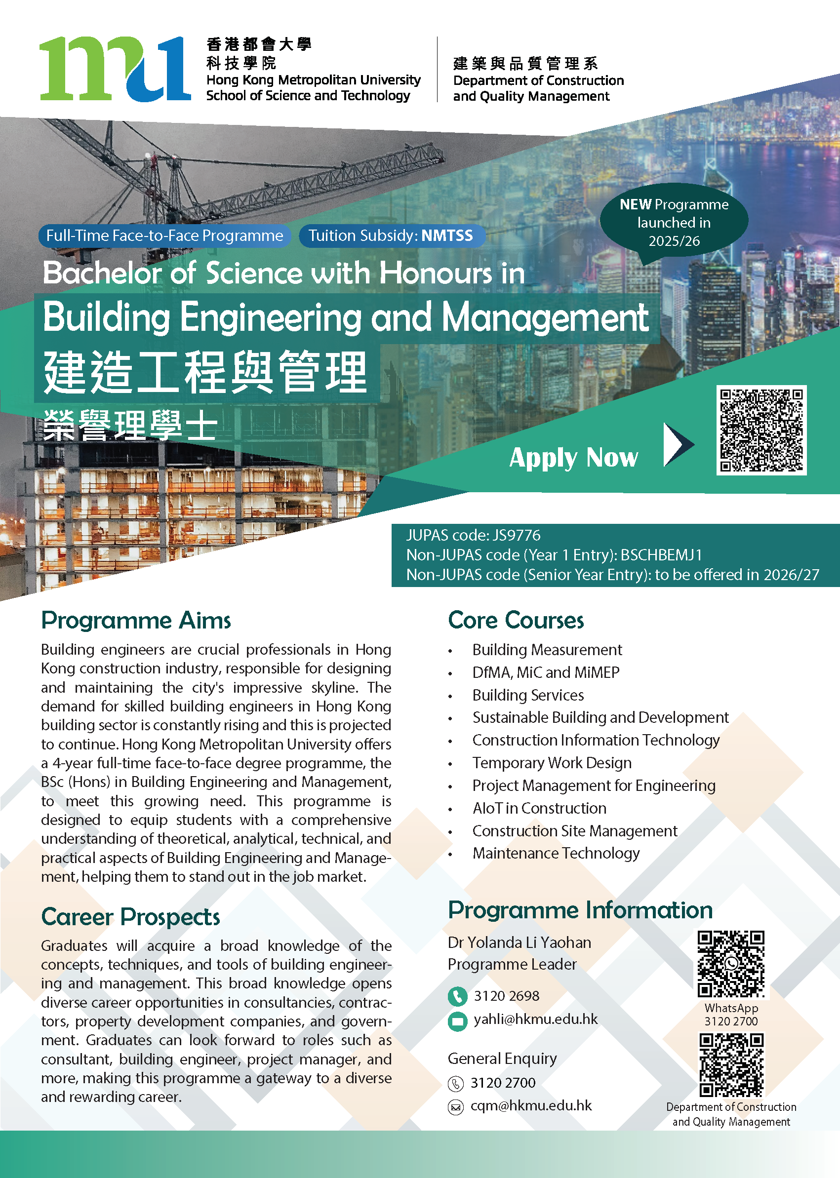 The Department of Construction and Quality Management (CQM) is a new academic department established in 2022 under the School of Science and Technology (S&T) at Hong Kong Metropolitan University (HKMU). CQM offers a variety of undergraduate and postgraduate programmes in the fields of civil engineering, building services engineering, surveying, engineering management, testing science and certification.