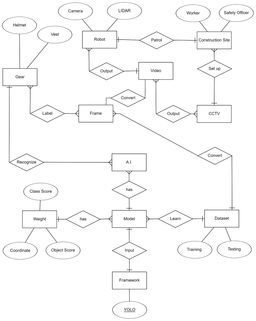 So, combined two parts of the system (A.I. and personal safety gear) will form the entity relationship diagram (Figure 2.) which showed how the A.I. recognize gears.