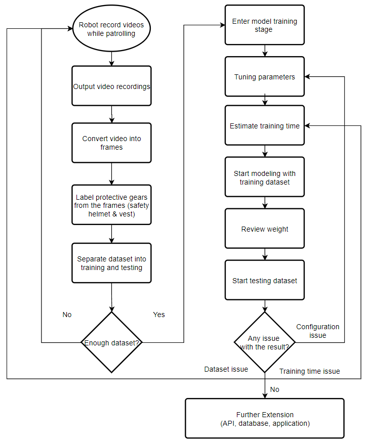 This flow starts with the quadruped robot recorded source videos while patrolling in the construction site. After the patrolling run down, the robot will back to its starting position and the operators will start outputting the latest video recordings by remoting its computer build-in the robot. To make the video into usable dataset, first, the videos will be converted into frames in an image form. The video may convert into 30 images based on the original FPS (frame per second) of the video. After that, researcher or operators will start labeling the images with a specified tool – LabelImg. The labeling process will be focus on three targets including safety helmet, safety vest and worker. This will form the dataset this project needs. Then, the dataset will be separate into two parts: training and testing. They involved 80 percent and 20 percent of the total dataset respectively. Then, the system would enter the first decision making point, if the user determined the dataset is not enough for starting the training, the system will back to the robot recording videos while patrolling process until the user is satisfied with the amount of dataset.