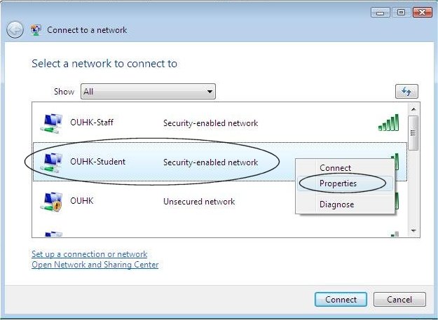 Ø A list of available wireless network with SSID will be shown. For WPA-enabled network, it is indicated with Security-enabled network. Click on the appropriate one and then the properties item